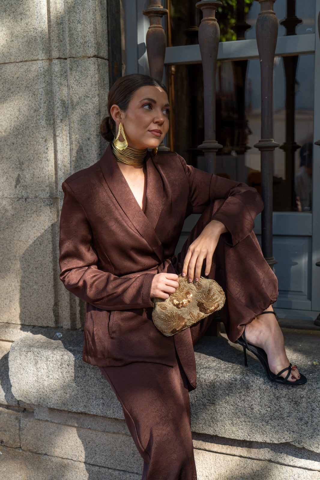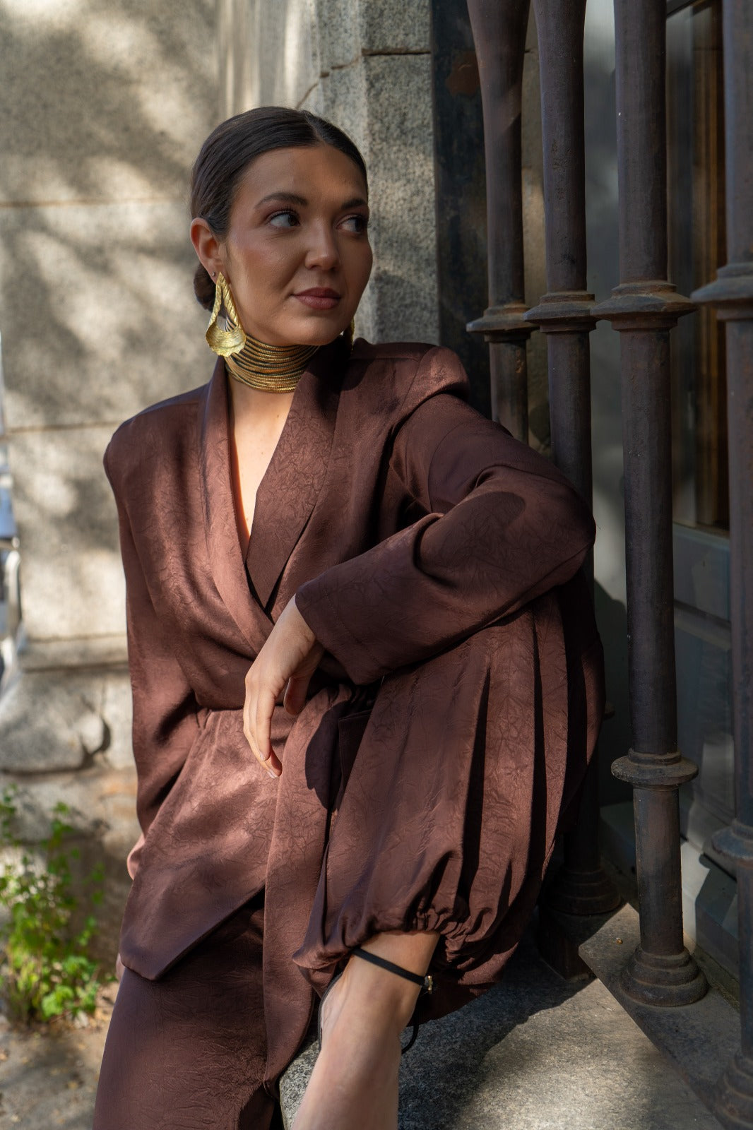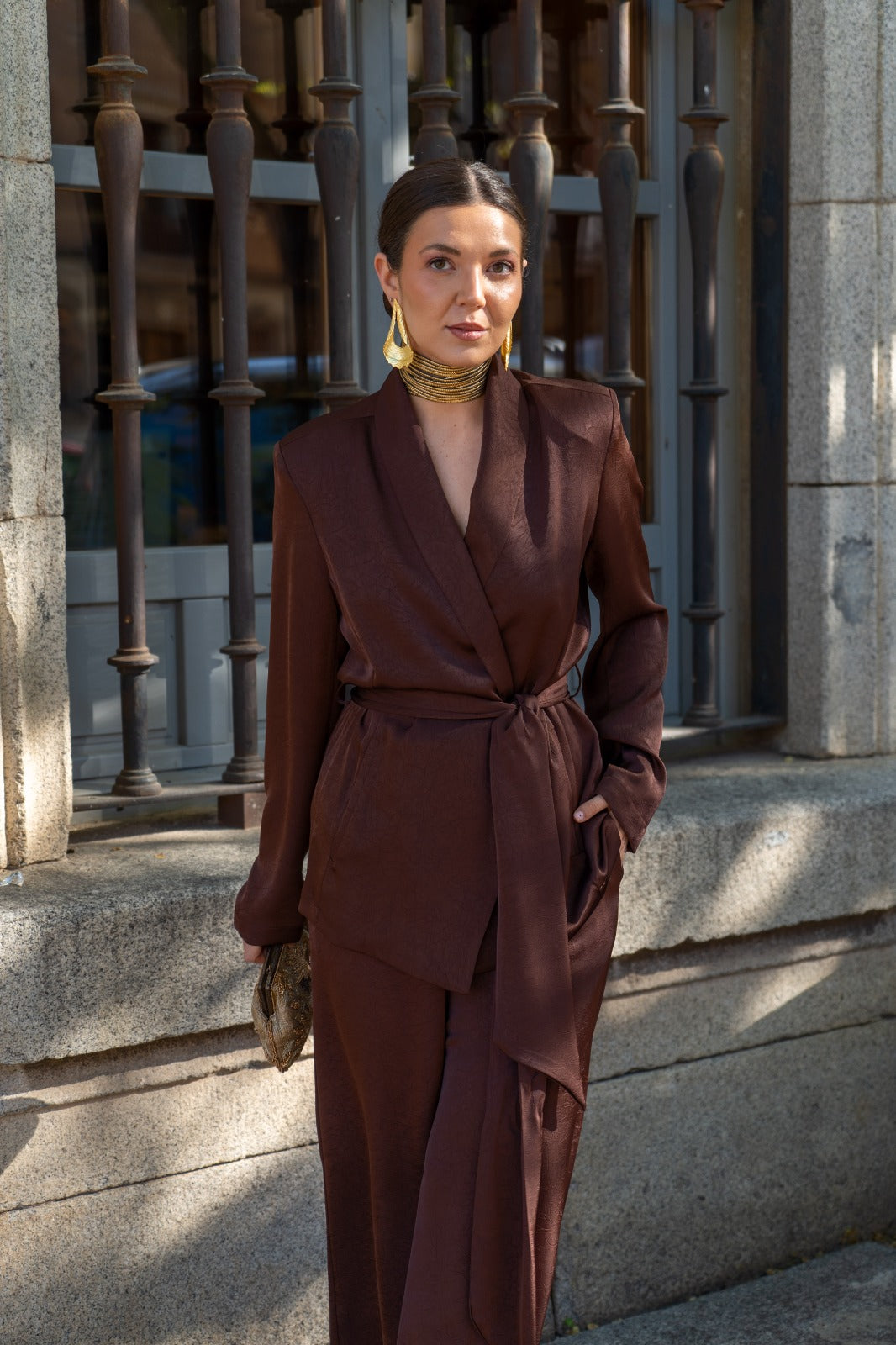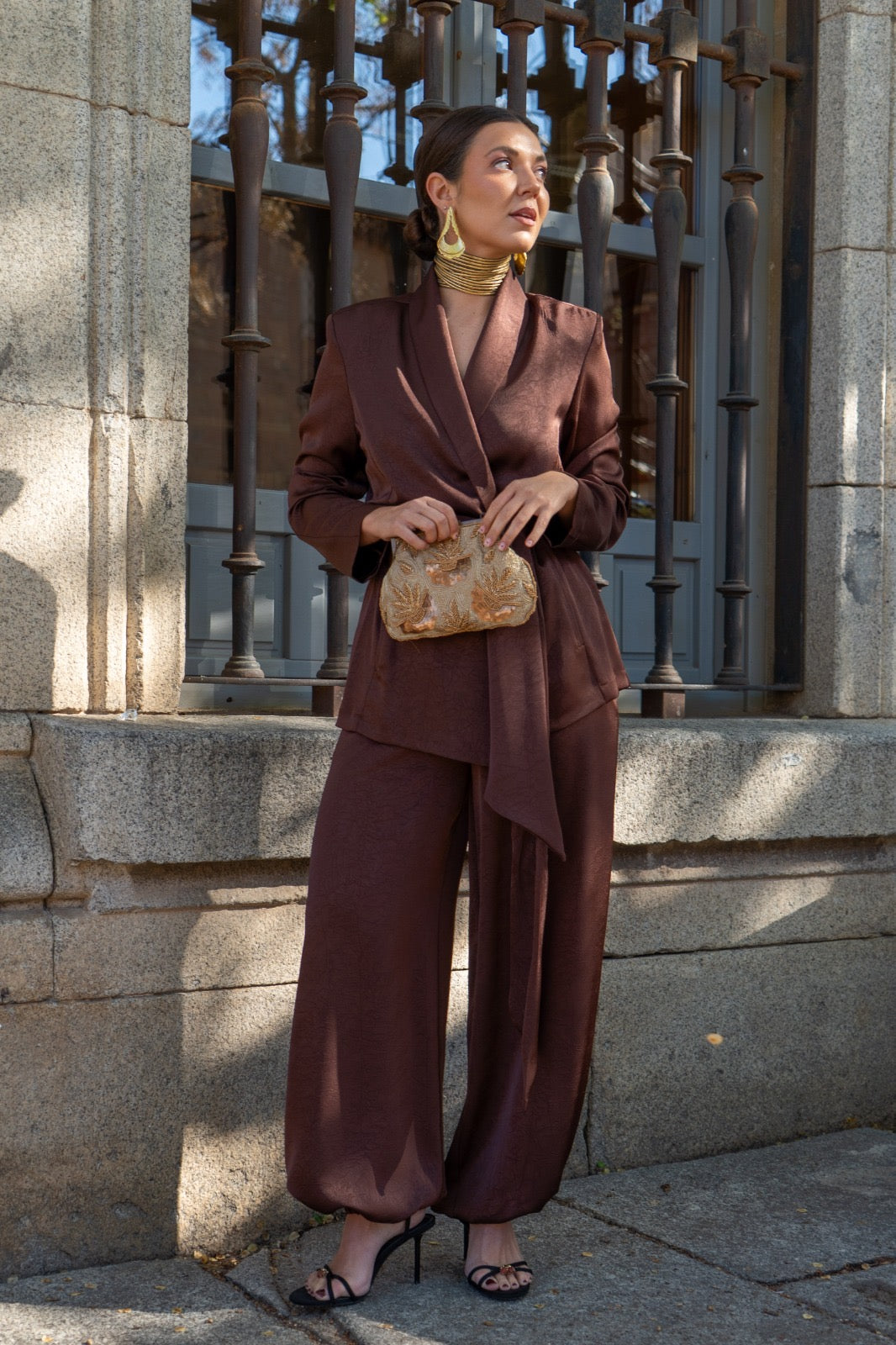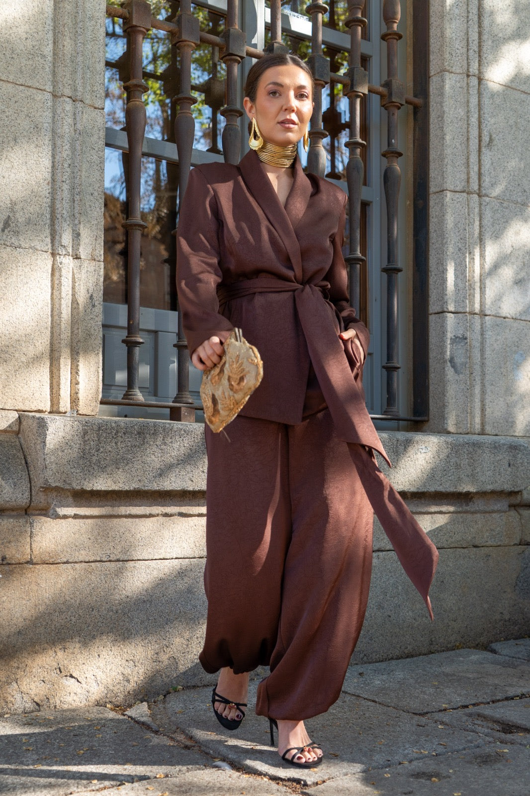 Set consisting of a wrap jacket, tied with a bow, and baggy trousers, elasticated at the back of the waist, side pockets. In brown.