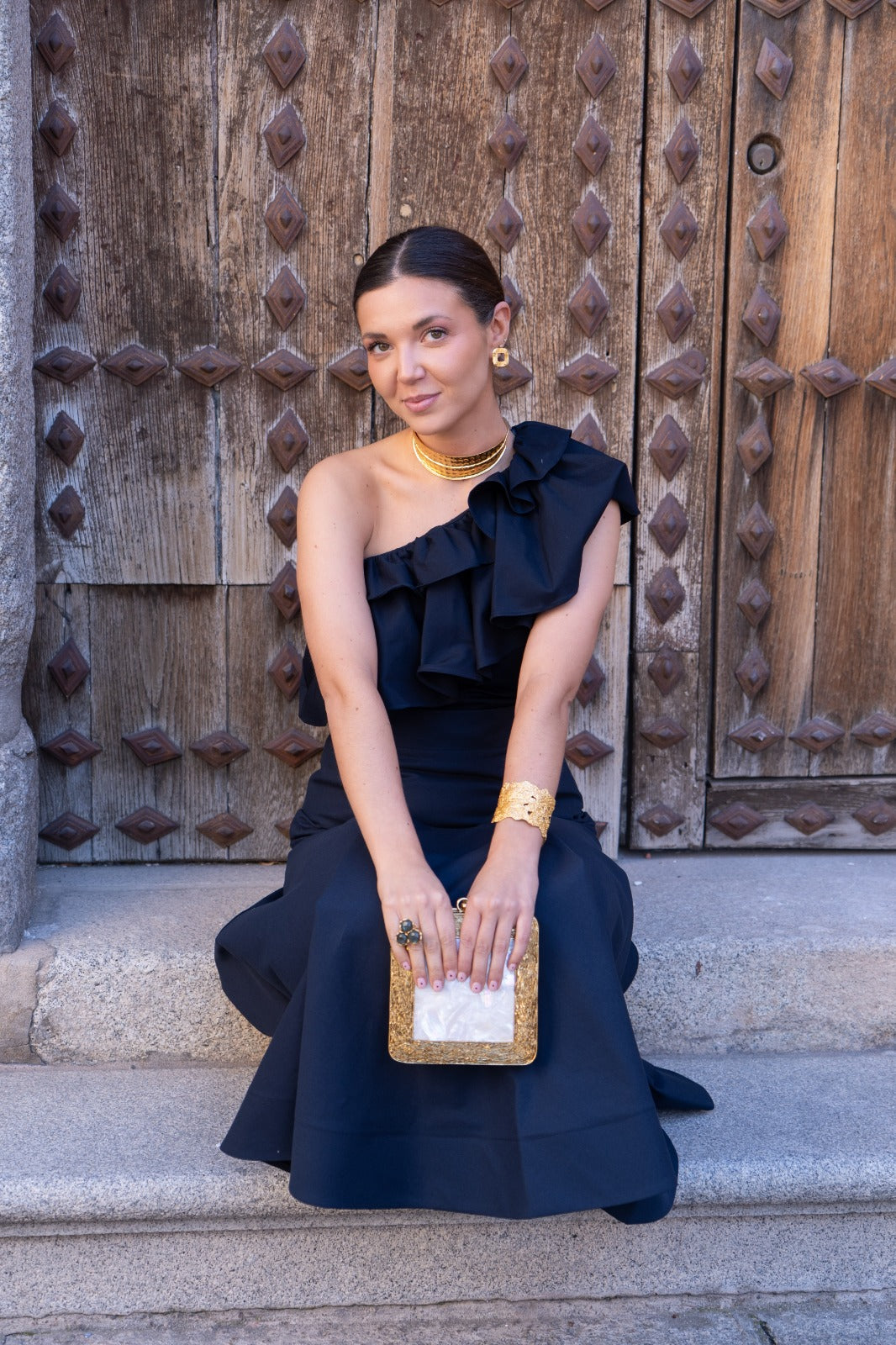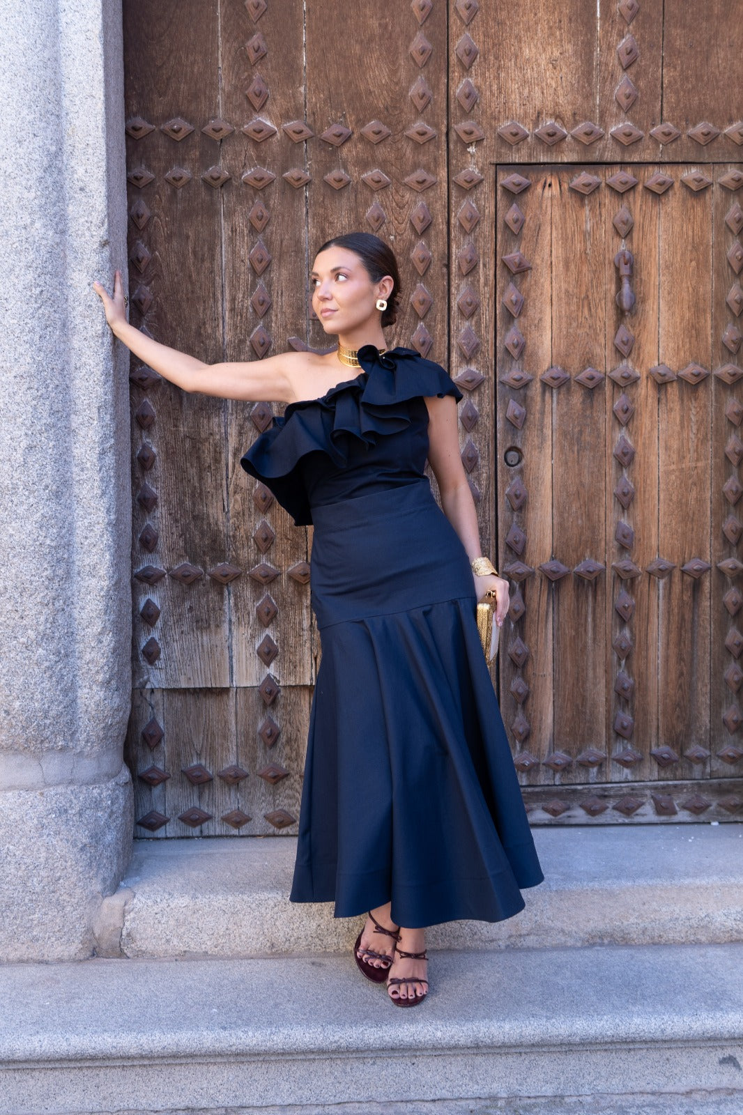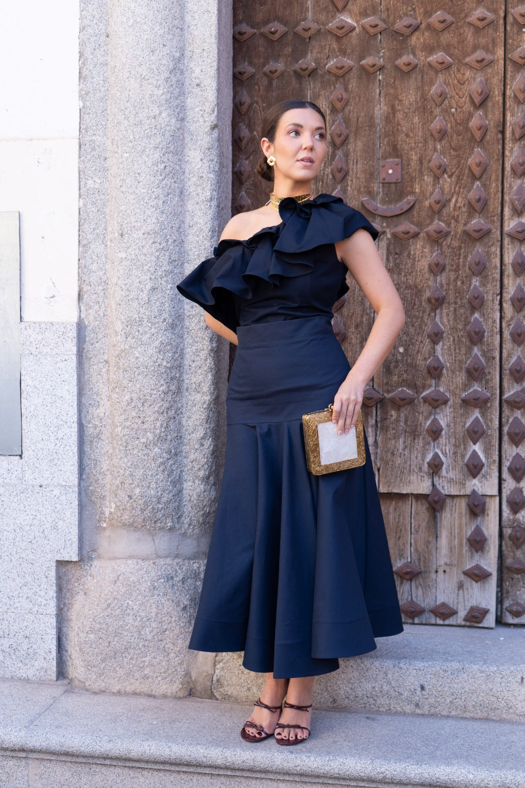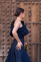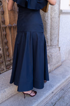 Set consisting of an asymmetric top with a maxi ruffle and a fitted skirt that flares out at the bottom. In navy blue.