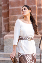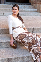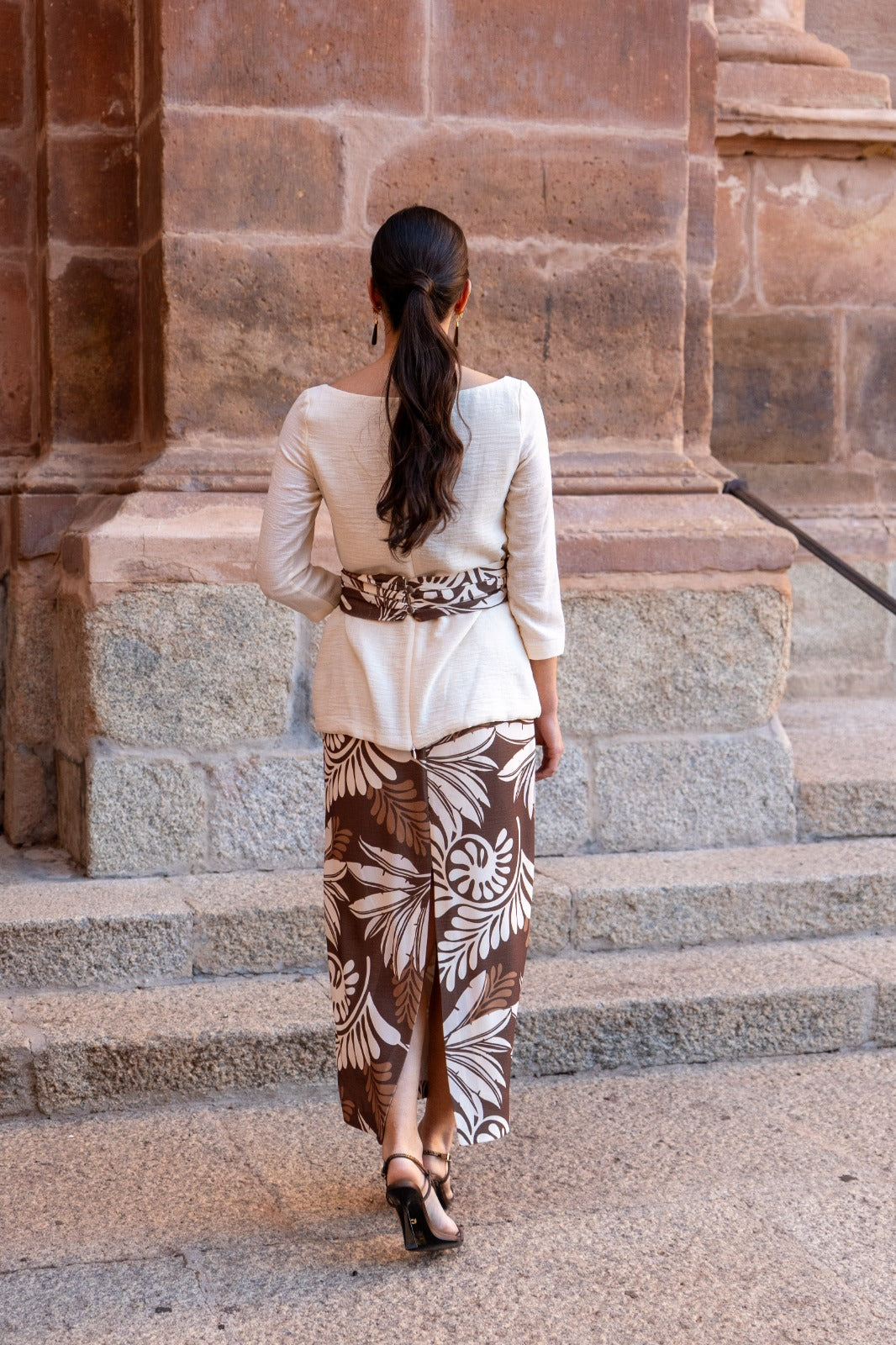 Conjunto compuesto por blusa escote redondo, manga francesa y falta cintura alta, abertura trasera, cinturón del mismo tejido incluido. En color beige y falda estampada en tonos marrones.