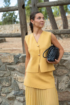 Knit set, consisting of a V-neck button-up vest and a knit skirt with pleats at the bottom. In mustard yellow.