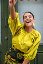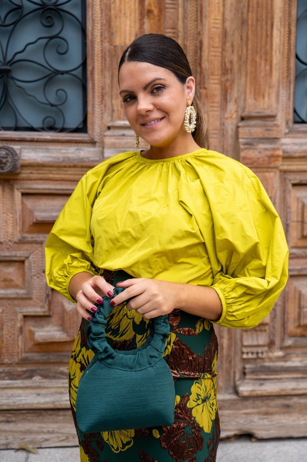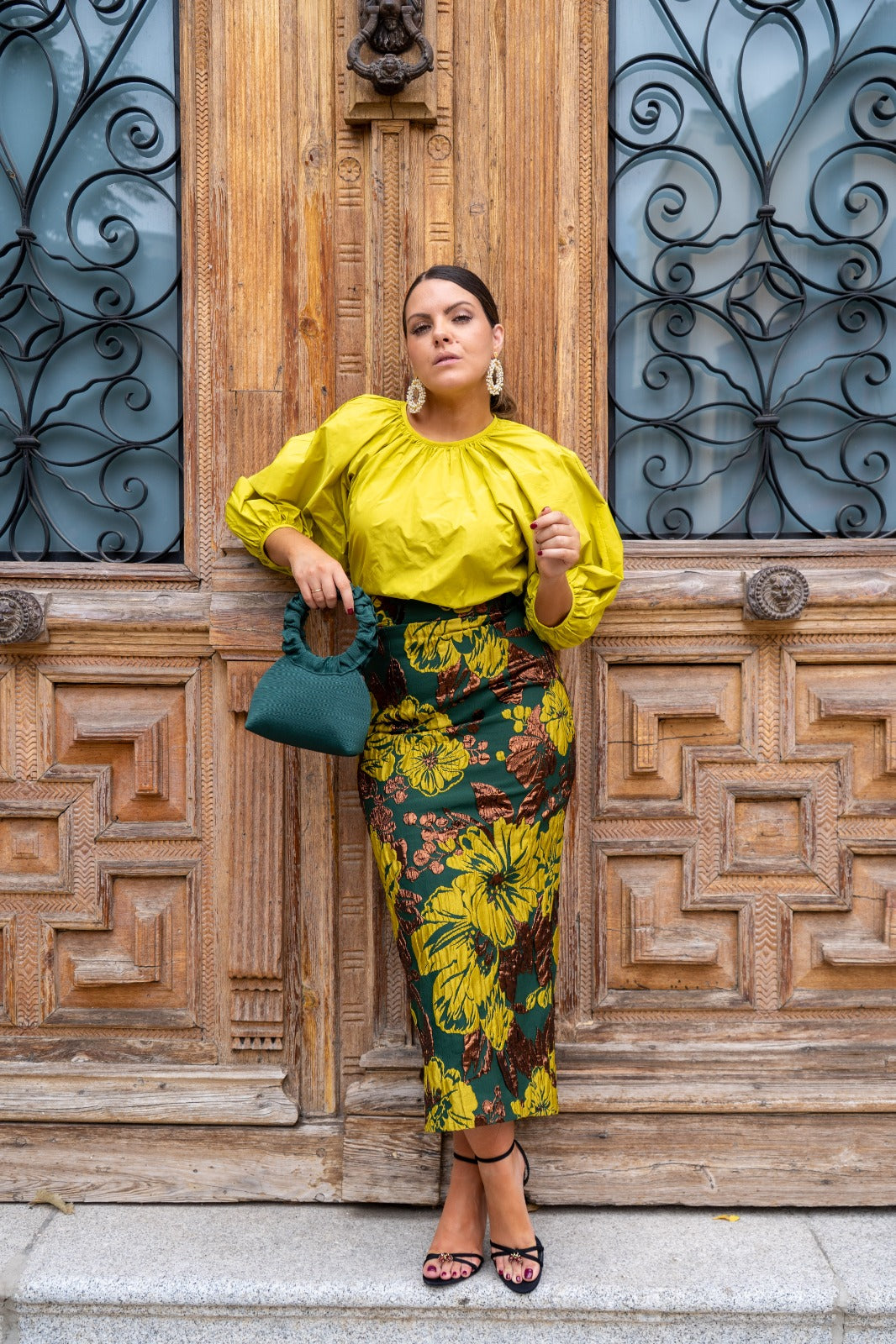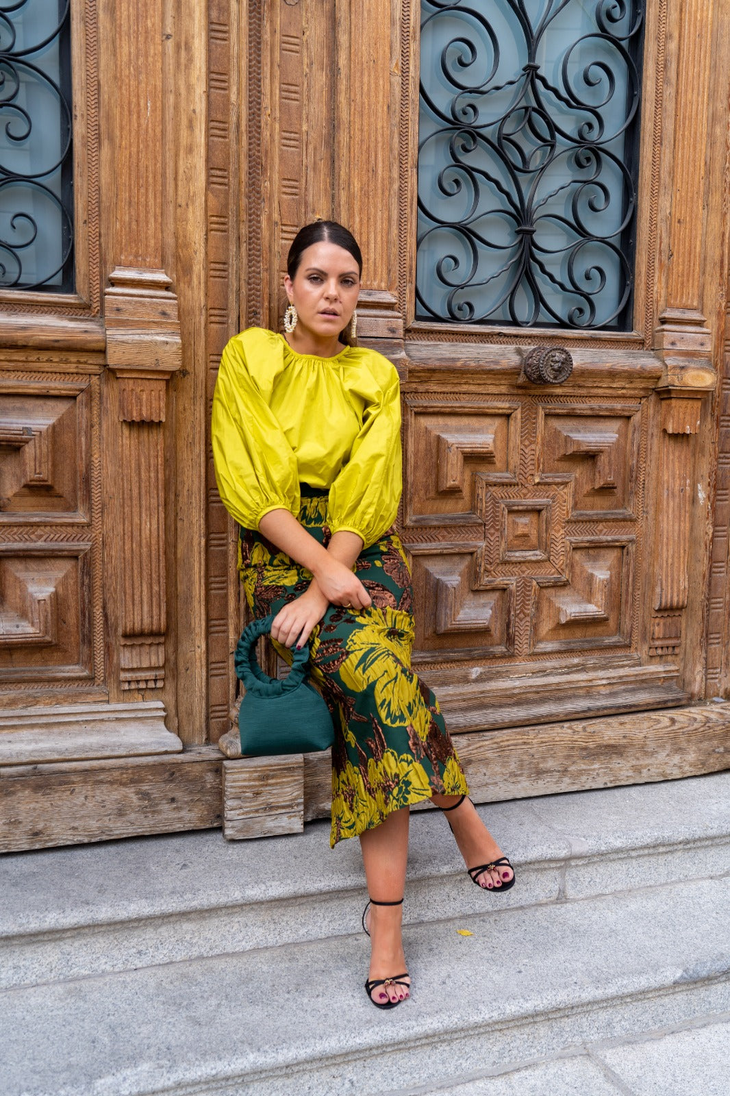 Set consisting of a blouse with a round neckline, gathered sleeves, and a high-waisted pencil skirt with a back slit, in lime green and prints.