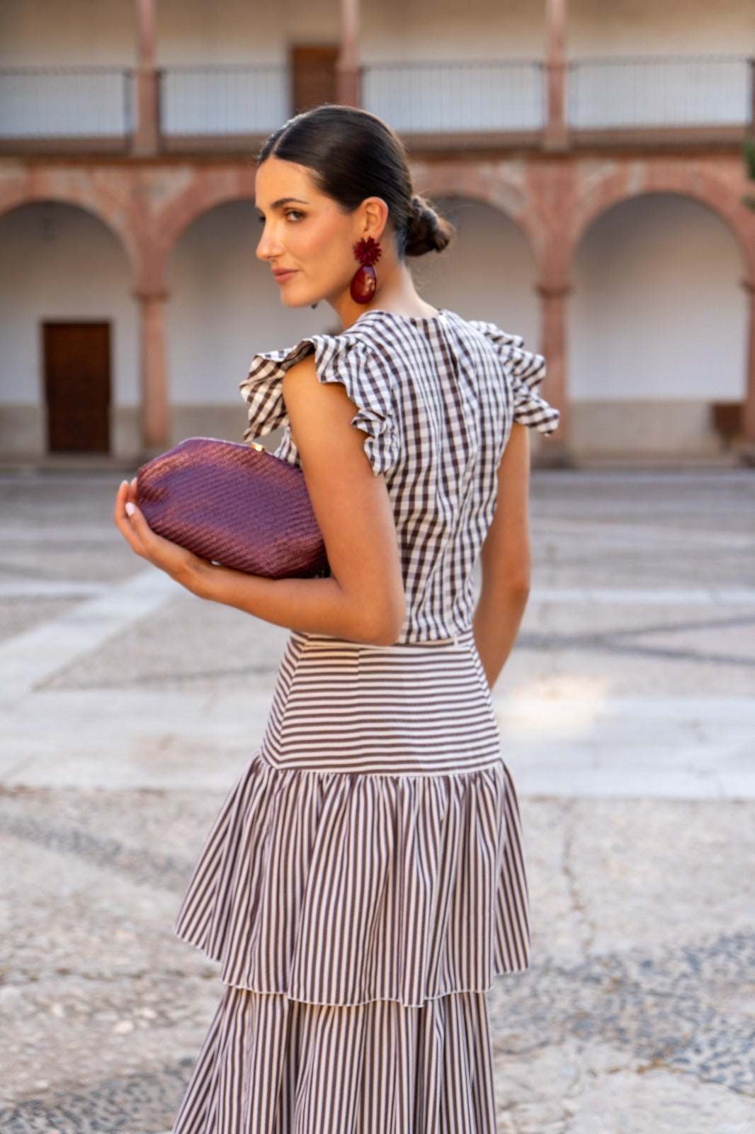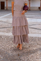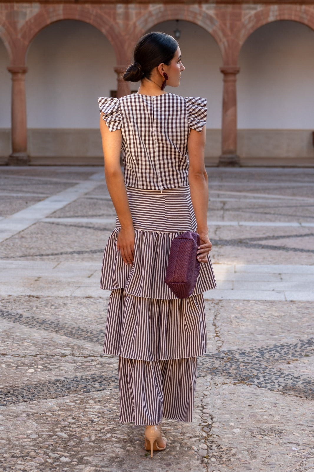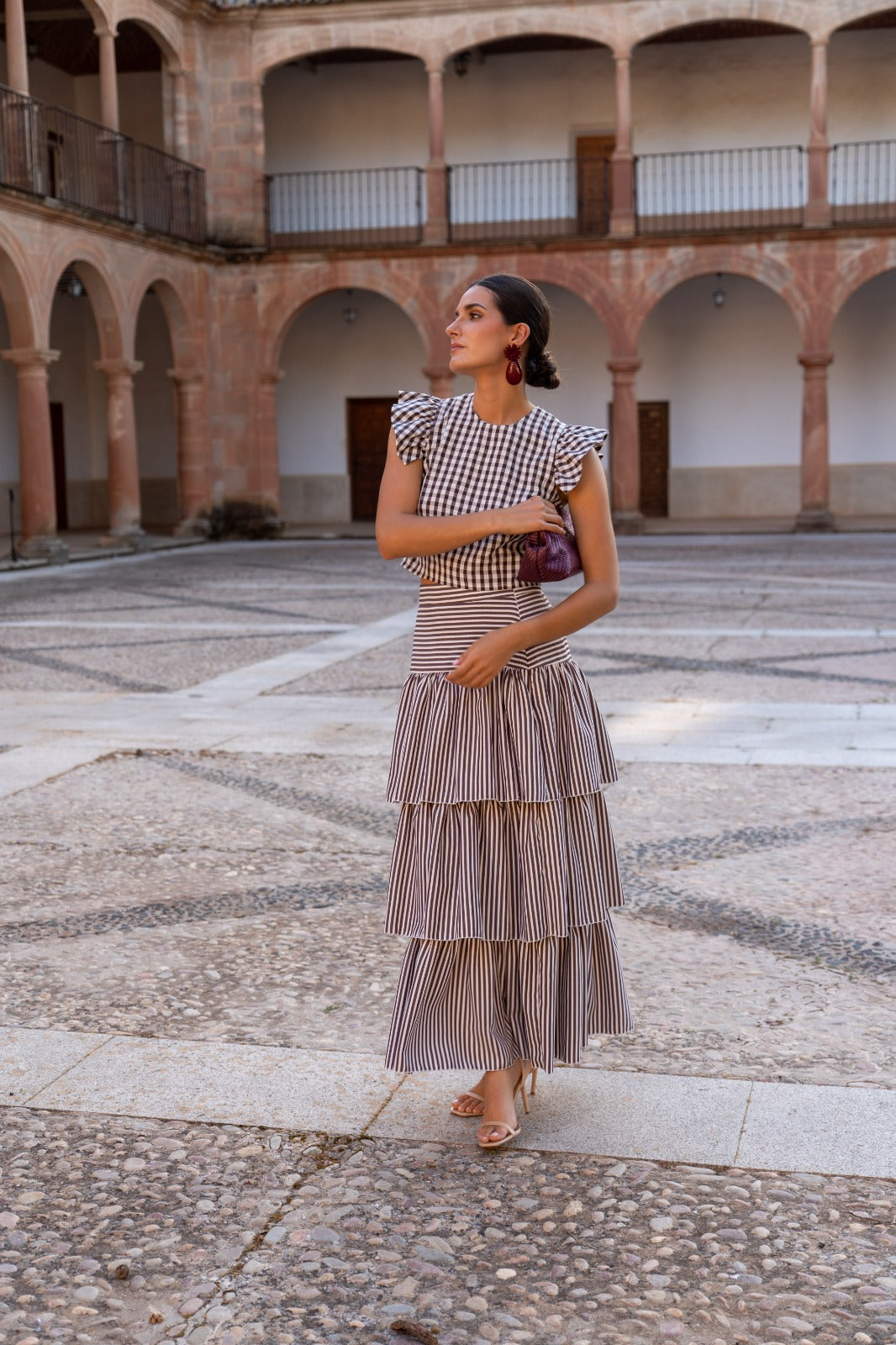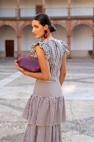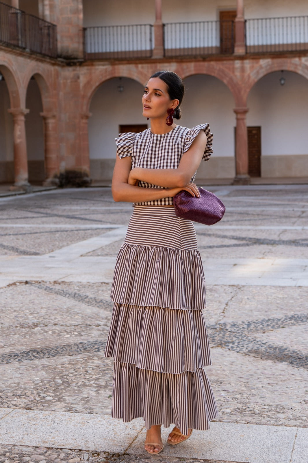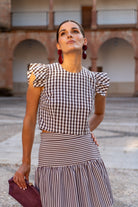Set consisting of a round-neck, sleeveless blouse with flutter sleeves and a high-waisted skirt with ruffles. In brown checks and stripes.