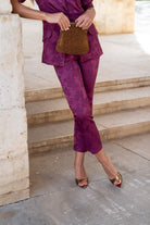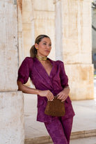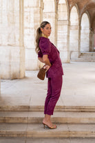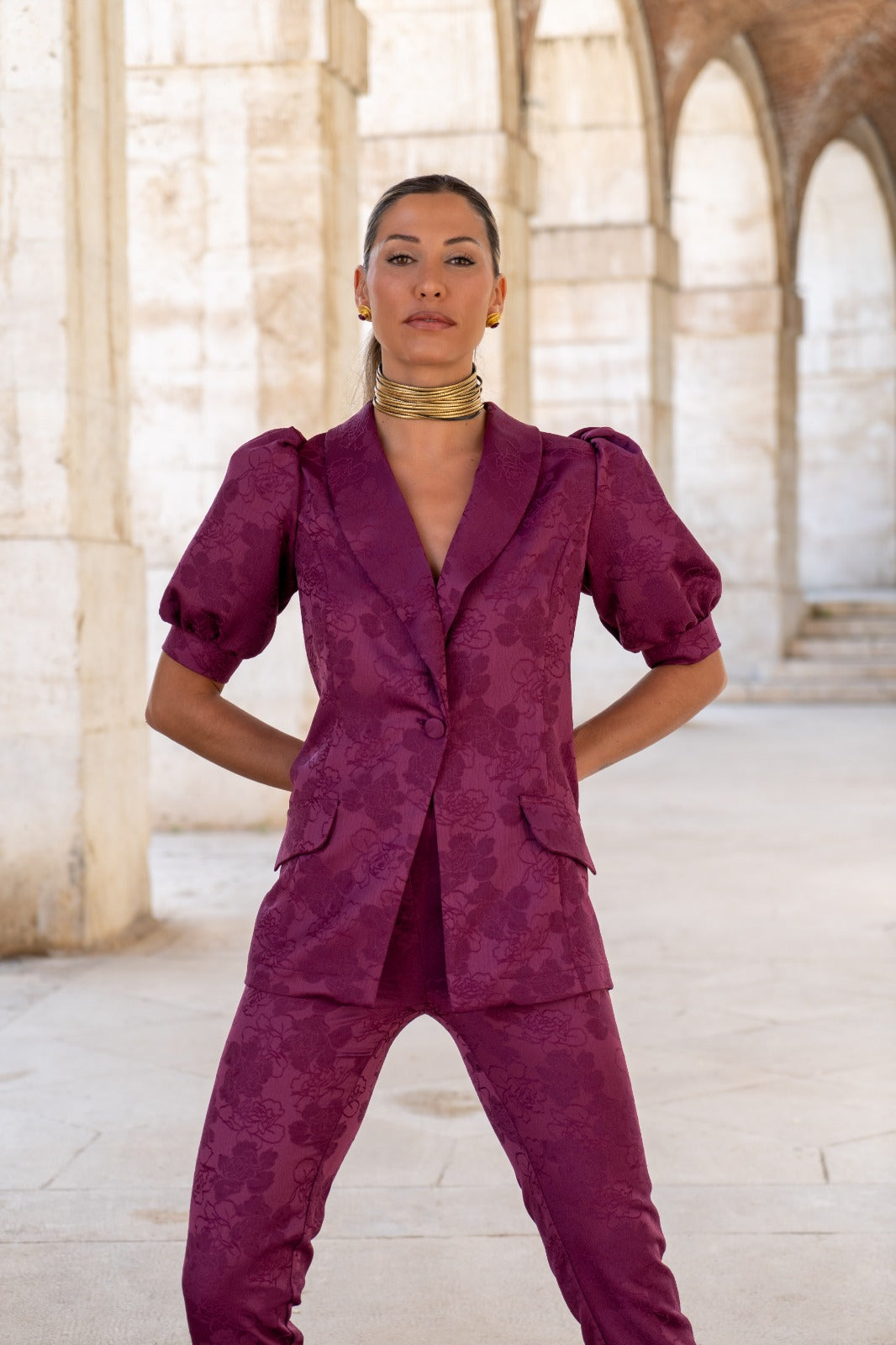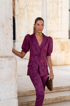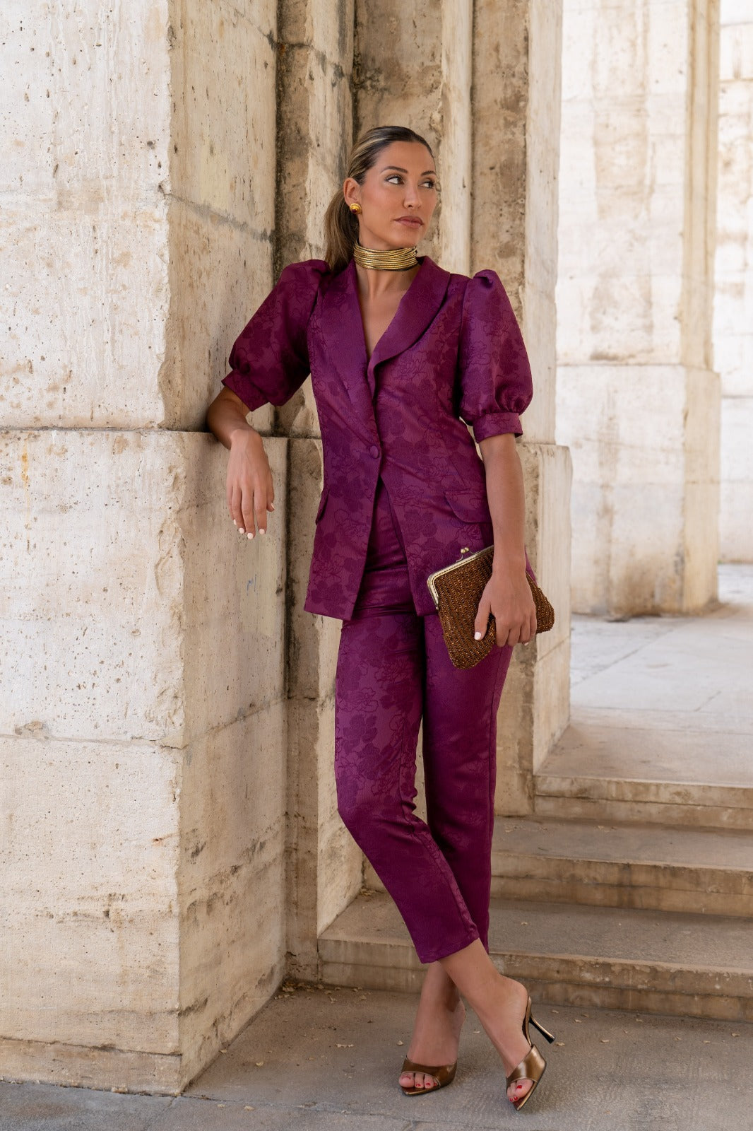 Set consisting of a short puff-sleeved jacket, central button, pocket flaps, and narrow-bottomed trousers. In brocade bougainvillea color.