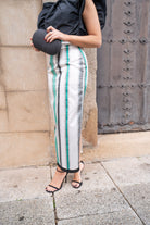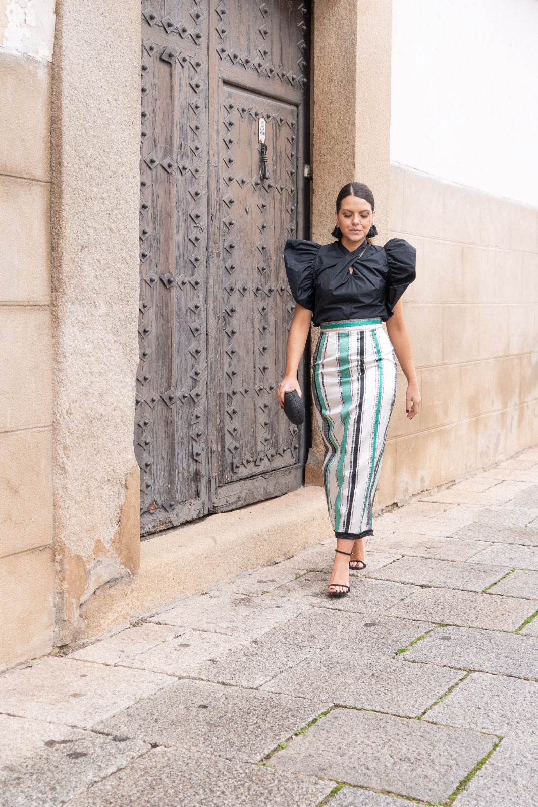 Midi skirt, canted waist, front slit, black fringe detail at the hem, in striped print.