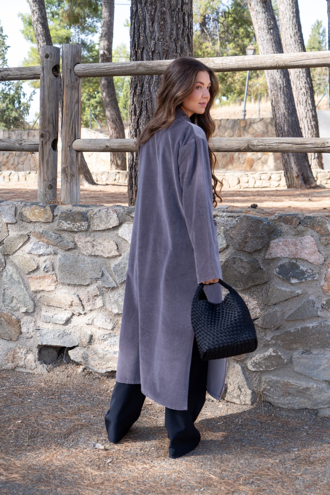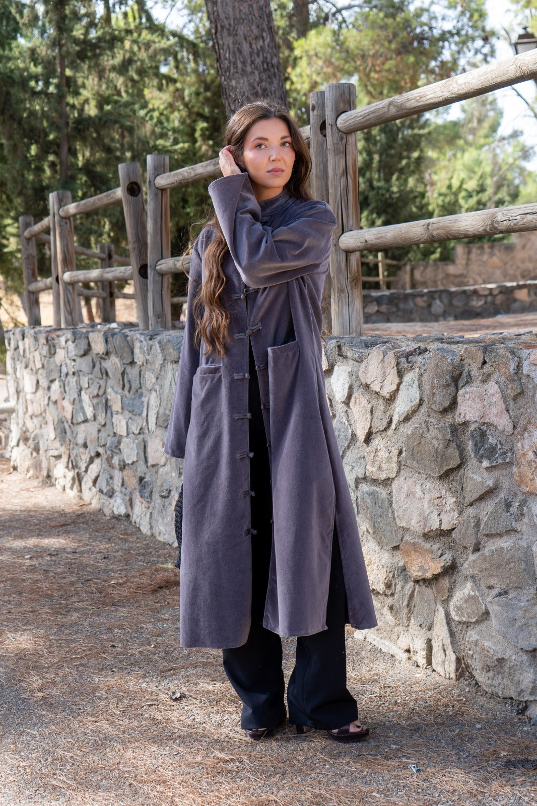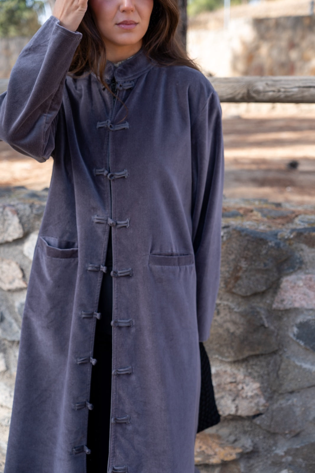 Straight kaftan, side slits, long sleeves, front pockets. In gray velvet.