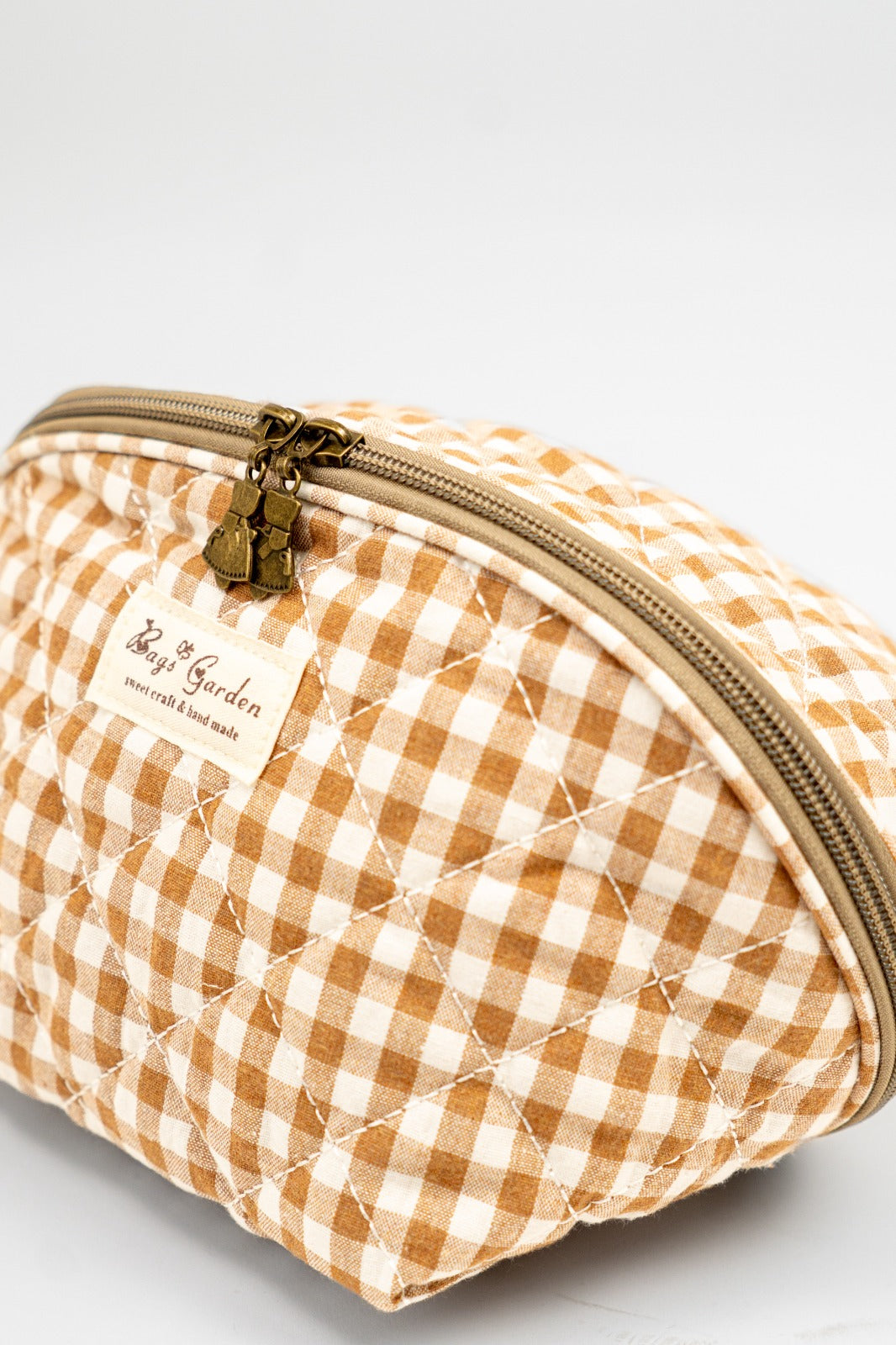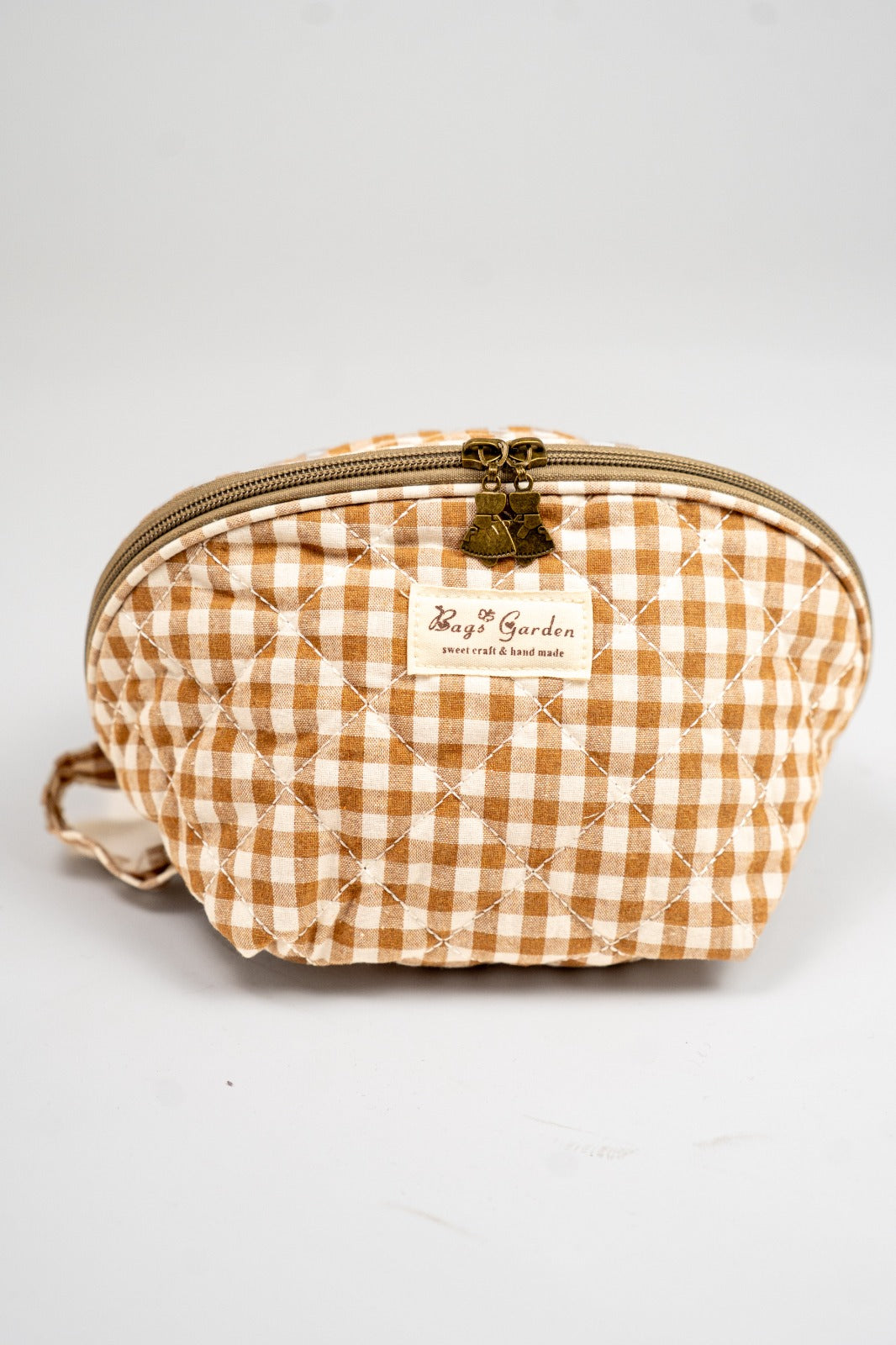 Toiletry bag with zip closure, handle on one side, in white and brown gingham.