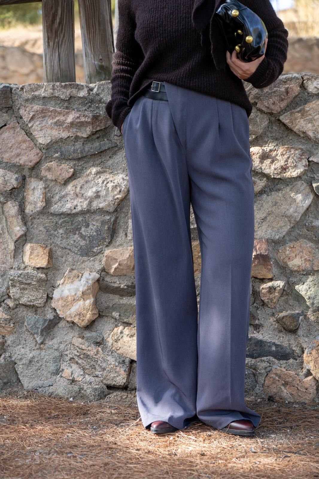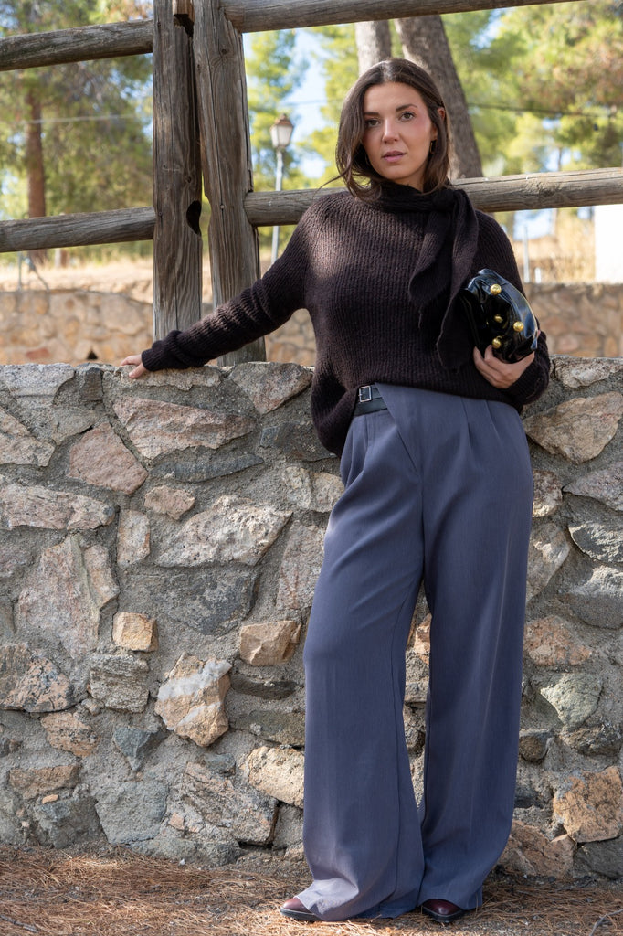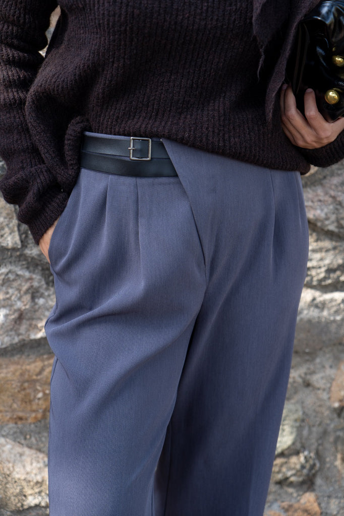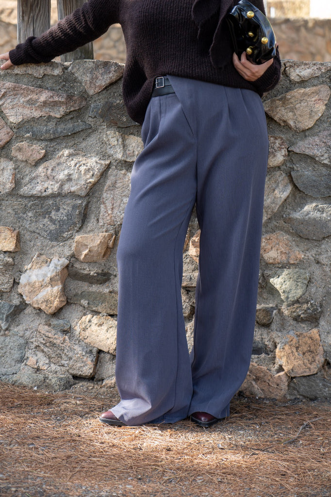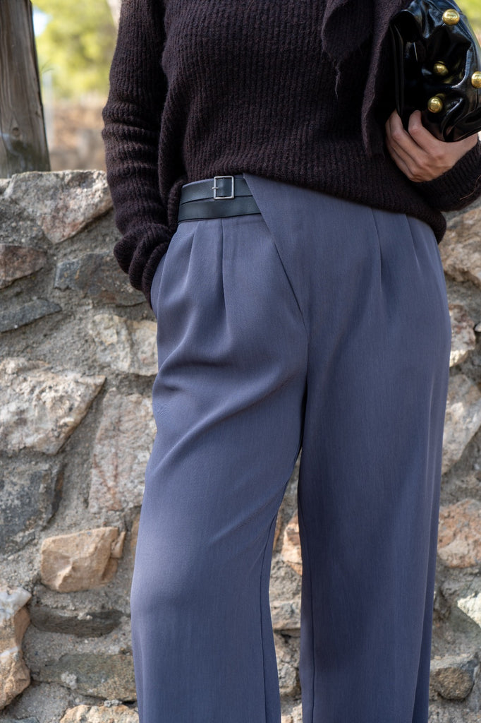 Pantalón tiro alto, bolsillos laterales, ancho, detalle cinturón doble en cintura. En color gris.