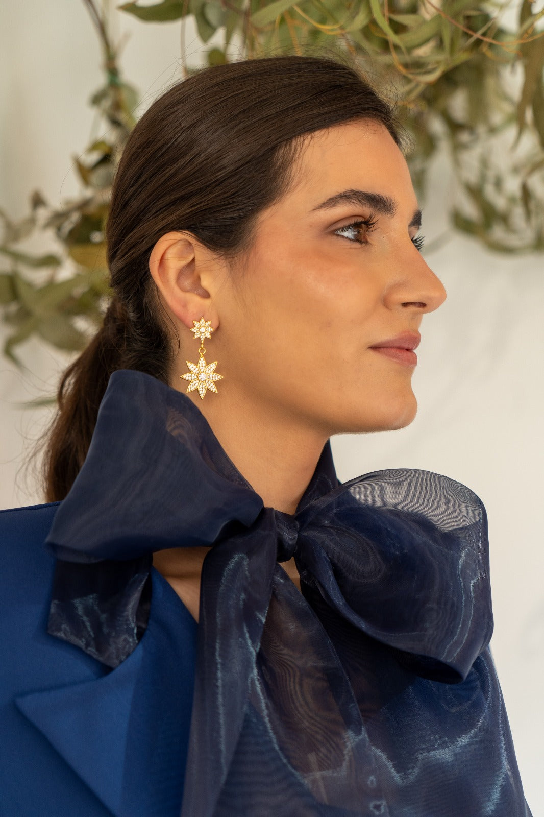 Double star pendant, a smaller one at the top and a larger one at the bottom, the stars are carefully set with cubic zirconia.