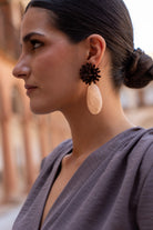 Earrings made of a flower and a stone, with a nut closure. In brown and beige.