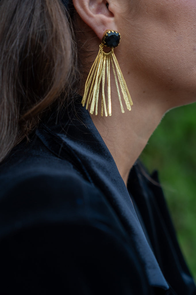 Earrings composed of a top stone and an elegant arrangement of golden sticks that form a semicircle at the bottom.