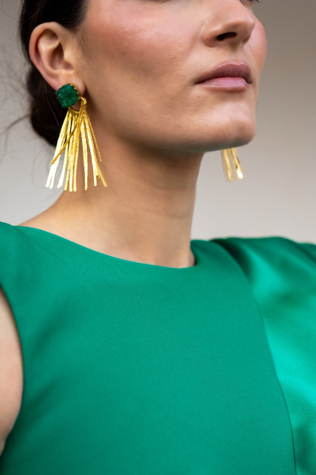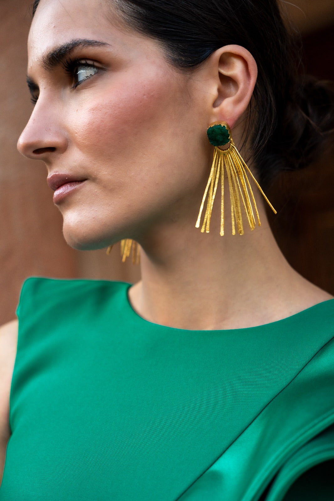 Earrings composed of a green top stone and an elegant composition of golden sticks forming a semicircle at the bottom.