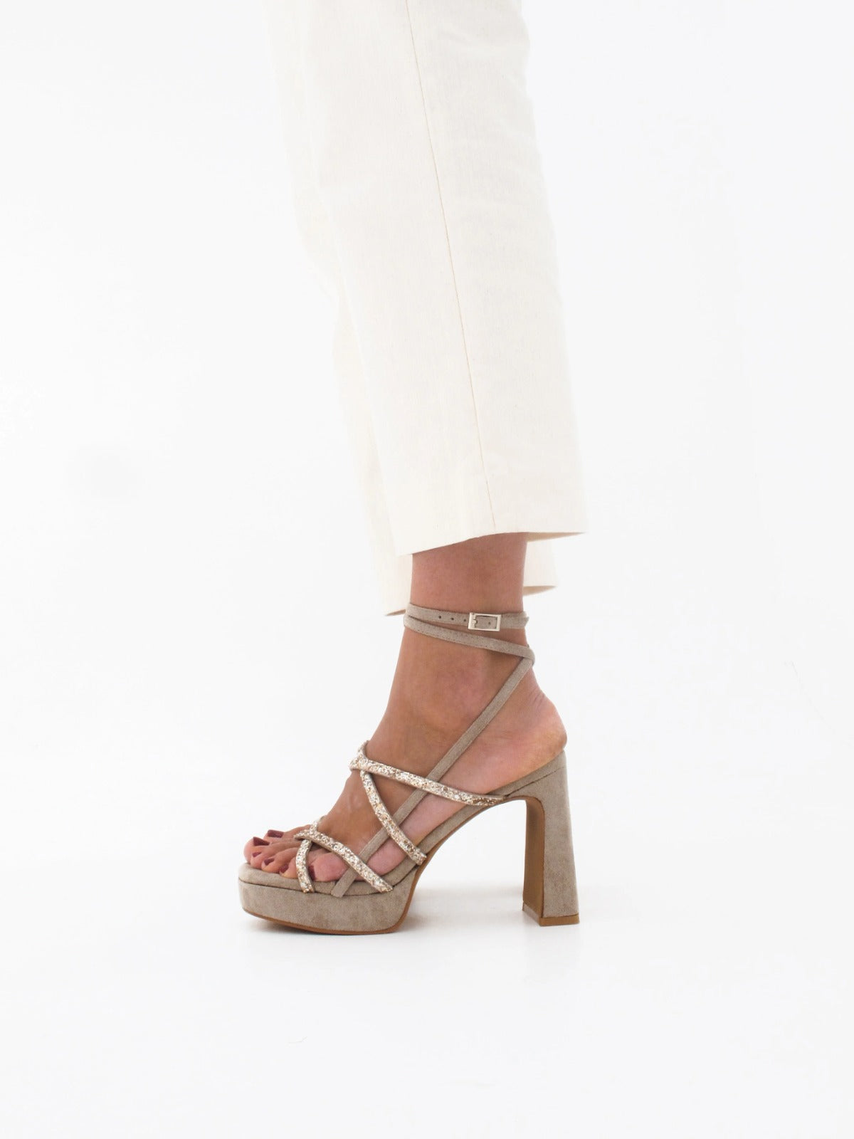 Sandalia de tacón de plataforma en ante vegano color topo. Compuesto por varias tiras con glitter a tono y dos tiras largas para atar en el tobillo. Cierre con hebilla.