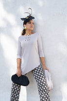 Round neck top, French sleeves, asymmetrical bottom, fully elastic, in beige.