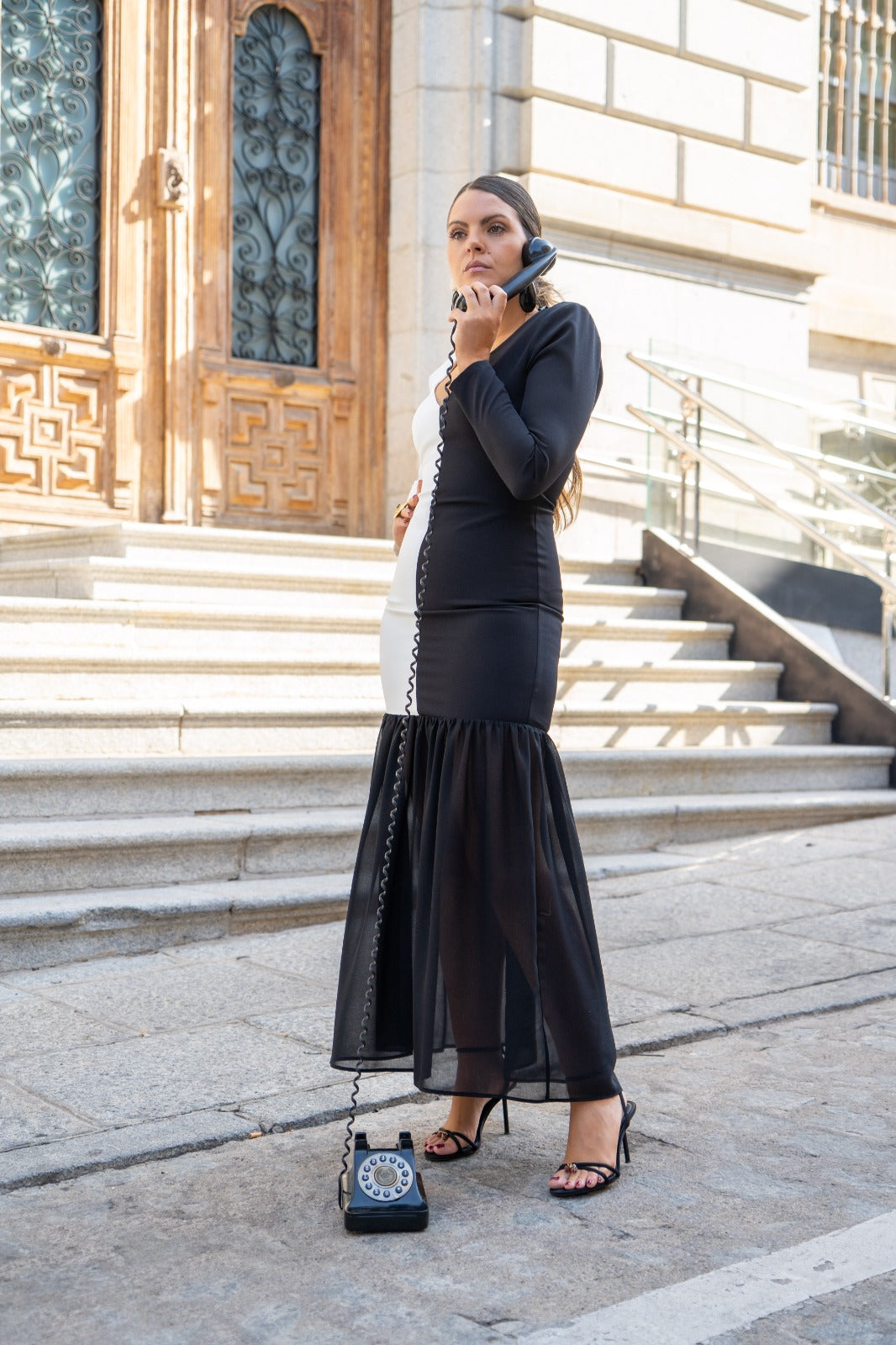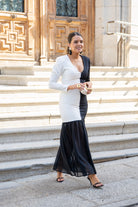 Midi-length maxi dress with a V-neckline, long sleeves, and a ruffled hem. Two-tone black and white.