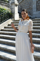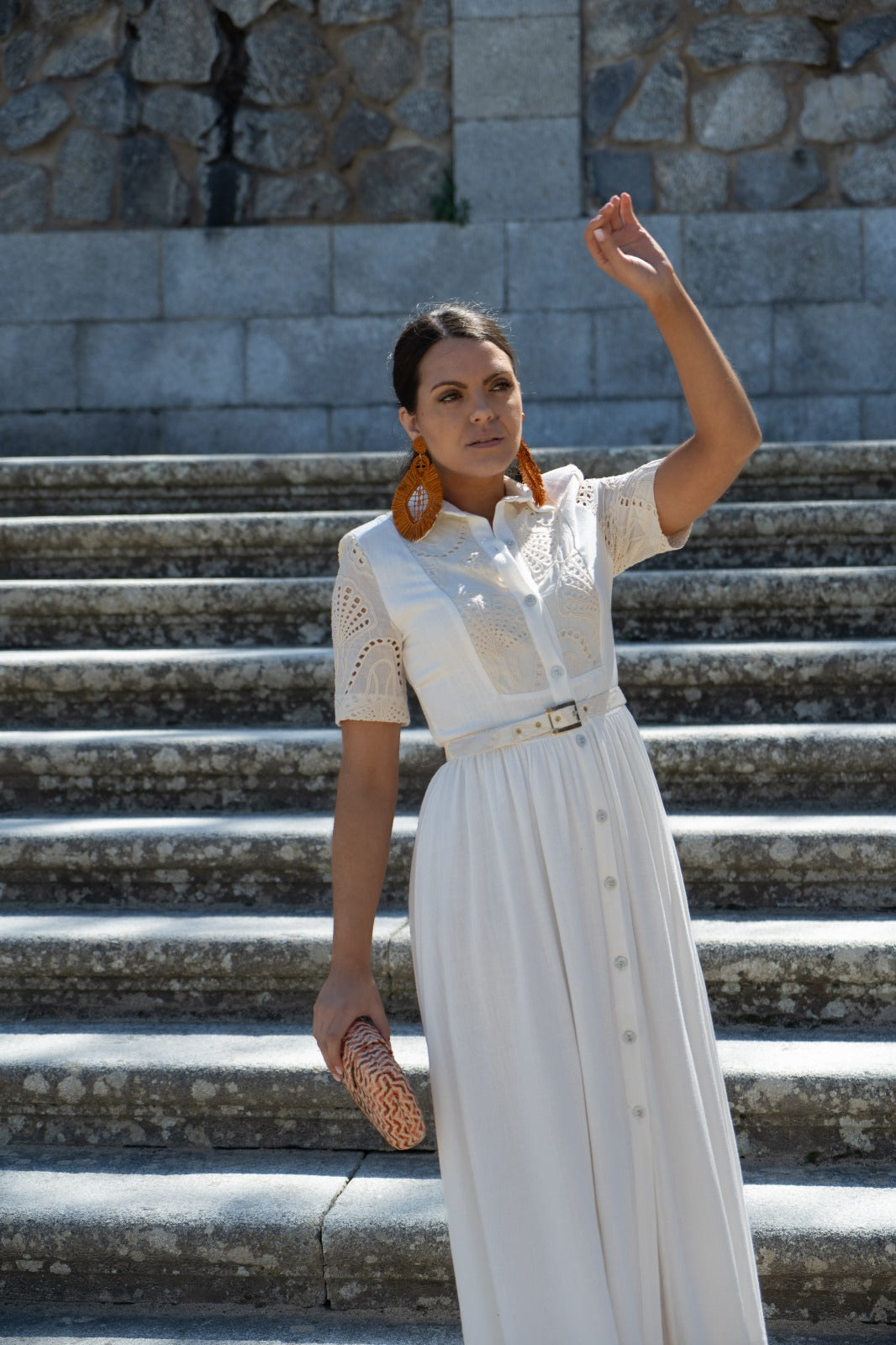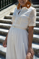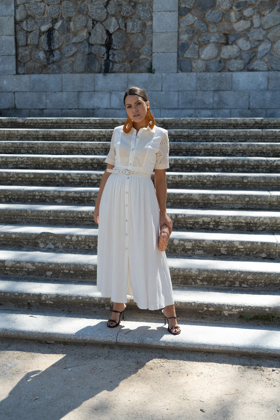 Midi dress with a shirt collar, short sleeves with openwork details, buttoned cuffs, and a belted waist. In beige.