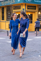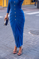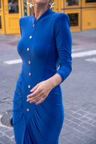 Dress Silk knit midi dress with a high neck, long sleeves, button detailing, and a gathered front. It's fully elasticated. In blue.