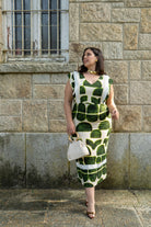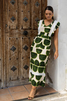 Midi dress with a square neckline, sleeveless ruffle, flared bottom, and back slit. In a green and beige print.
