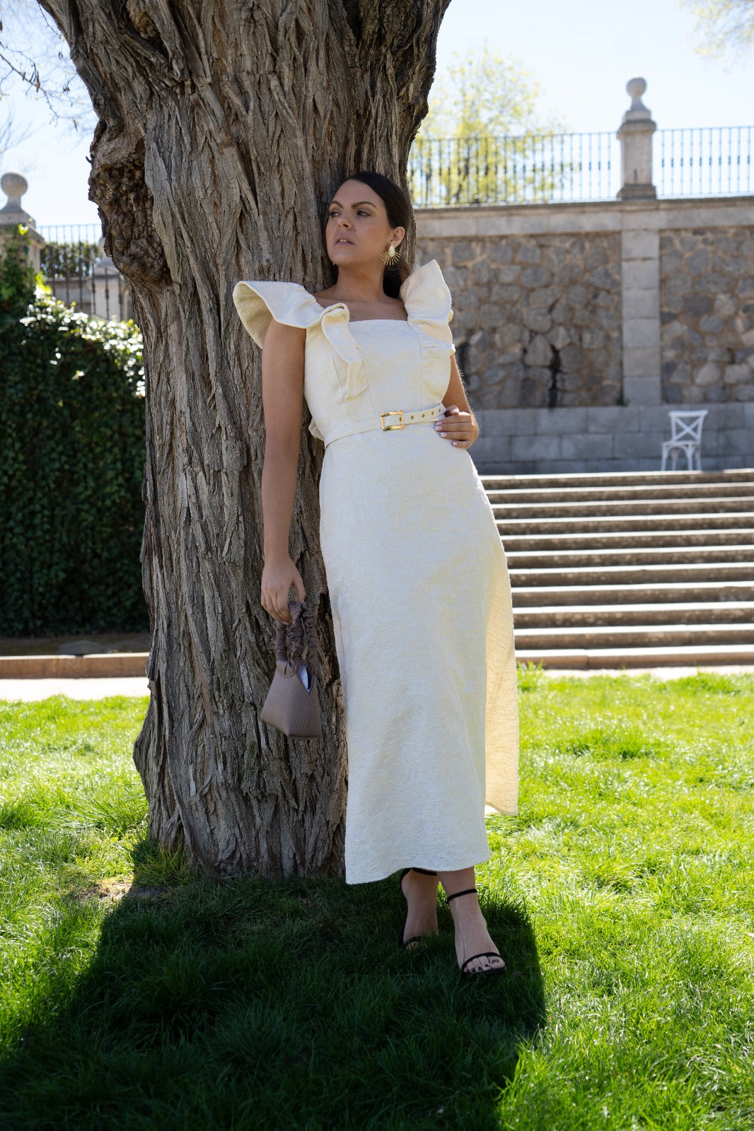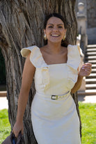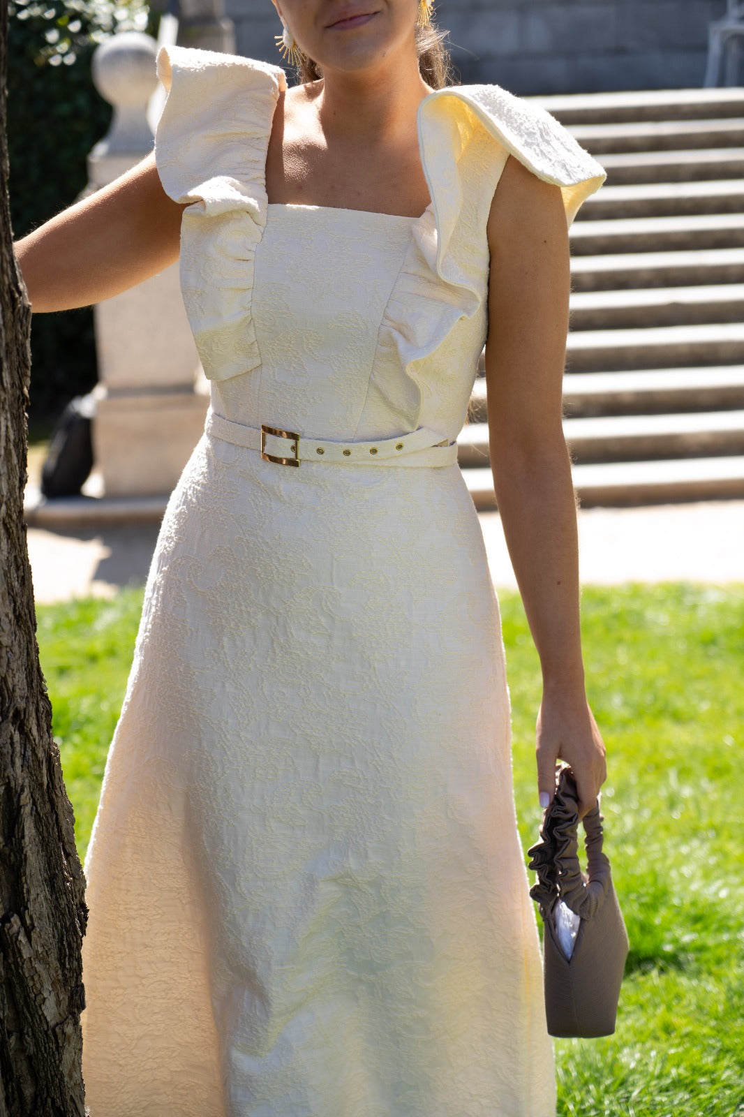 Midi dress with a square neckline and structured ruffles at the shoulders. In beige with an embossed floral print.