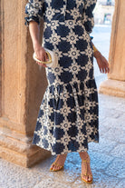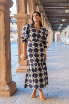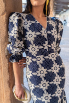 Vestido midi, escote a pico y botones, manga larga con volumen en hombros, entallado, falda con volante a la rodilla. En color azul con dibujo bordado en beige.