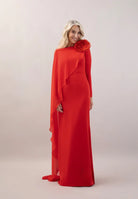 Crepe dress with a boat neckline and long sleeves. Fitted at the waist with a mermaid skirt. Asymmetrical chiffon cape that falls diagonally over the front of the bodice to the lower back. A matching hand-sewn flower adorns the shoulder.
