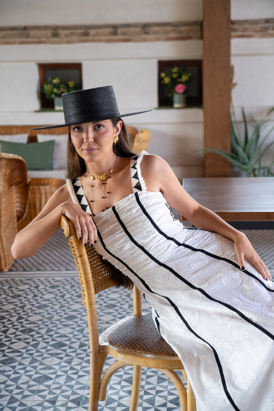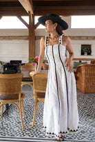 Midi dress with a square neckline, wide shoulder pads, flared at the bottom. White with black details.