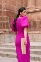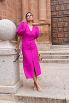 Vestido midi, escote en forma de V, manga corta abullonada, detalle botones delanteros (no se abren), abertura delantera. En color buganvilla.