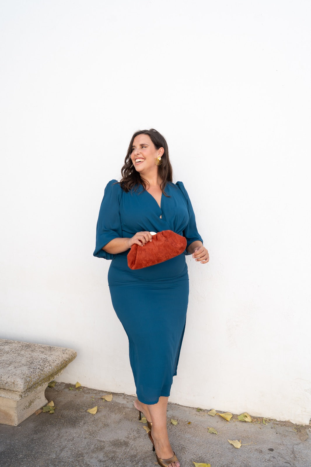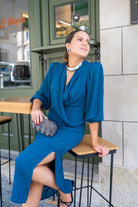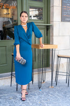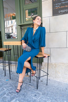 Midi dress with a crossover neckline, three-quarter sleeves with elastic cuffs, and a side slit in the front. Available in duck egg blue.