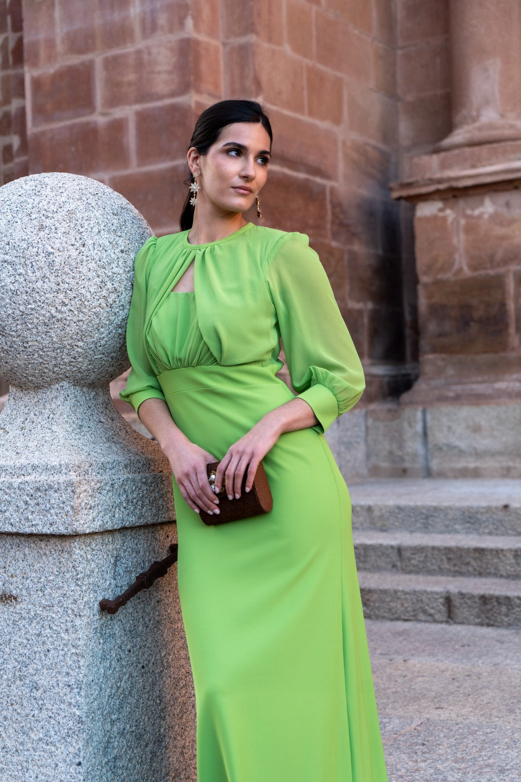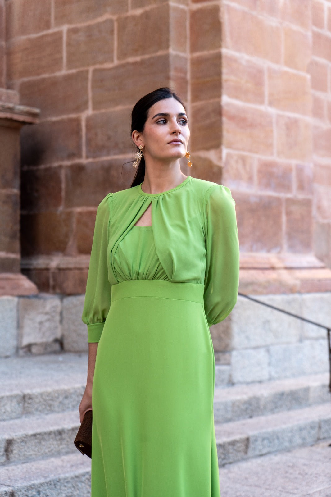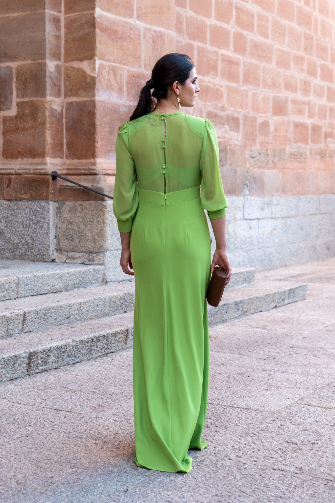 Vestido largo, escote redondo con pequeño escote, parte trasera abotonada, manga francesa en gasa con puño, corte en cintura, fluido. En color verde.