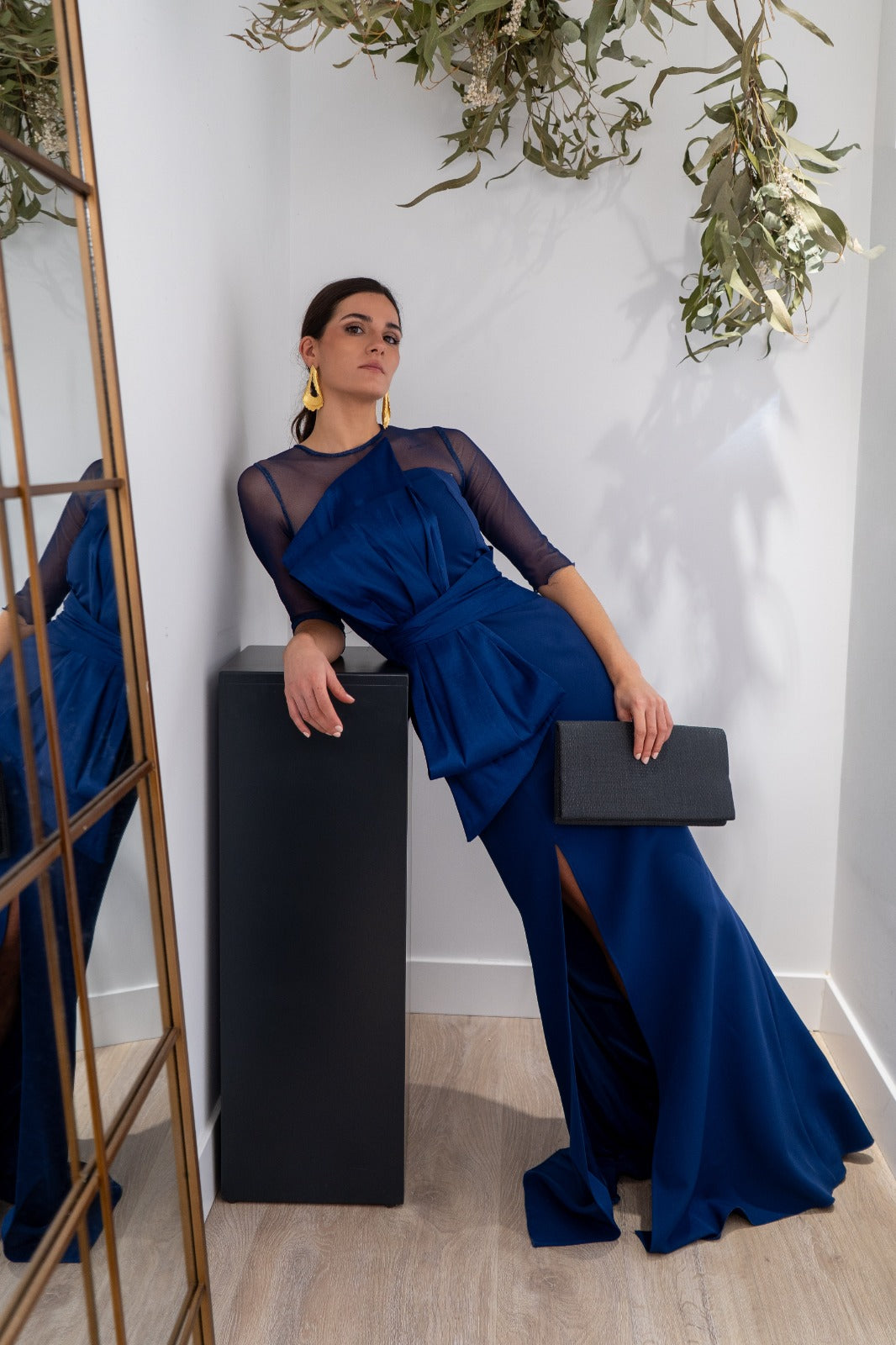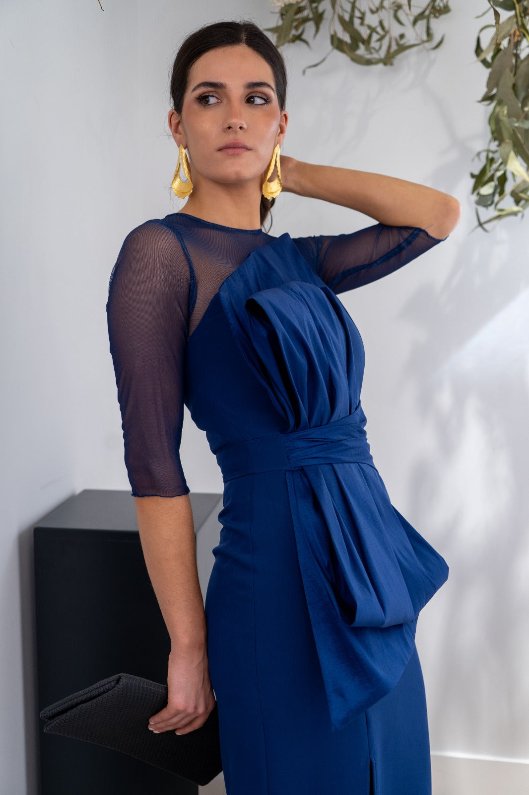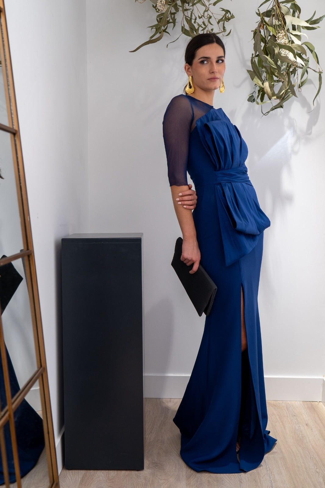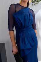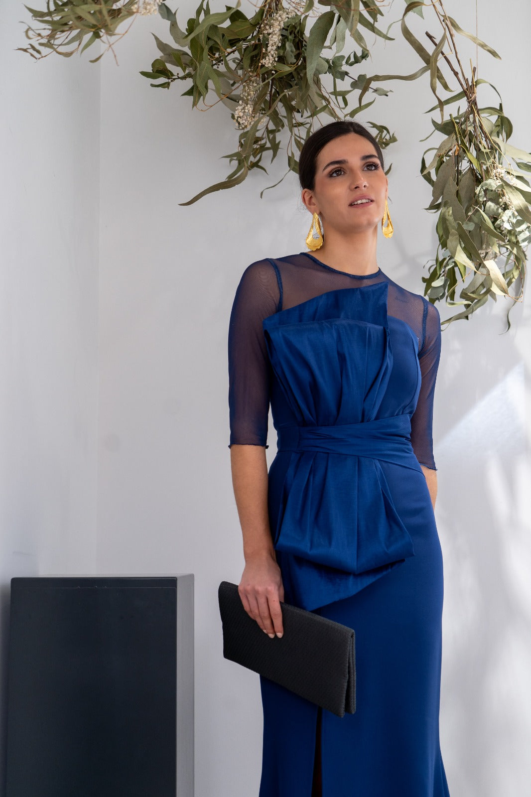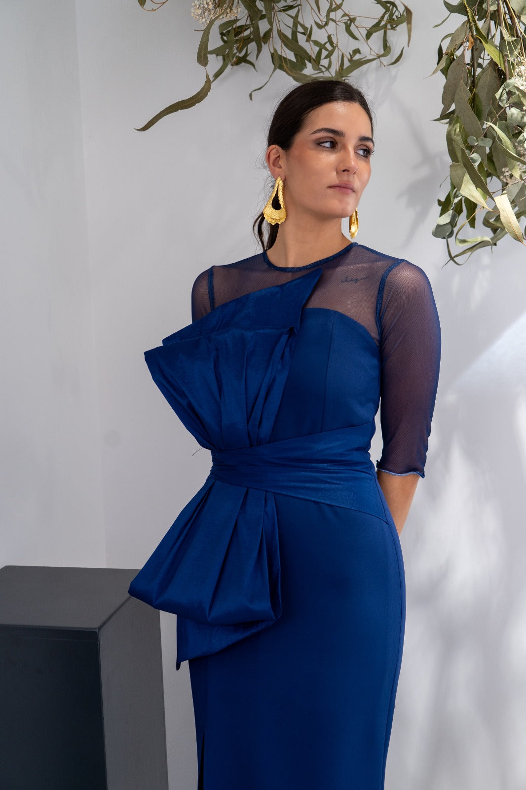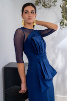 Vestido largo, escote redondo, parte de arriba en gasa, detalle lazo tafetán en la parte delantera, abertura delantera a un lado, En color azul.