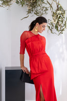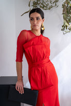 Vestido largo, escote redondo, parte de arriba en gasa, detalle lazo tafetán en la parte delantera, abertura delantera a un lado, En color rojo.