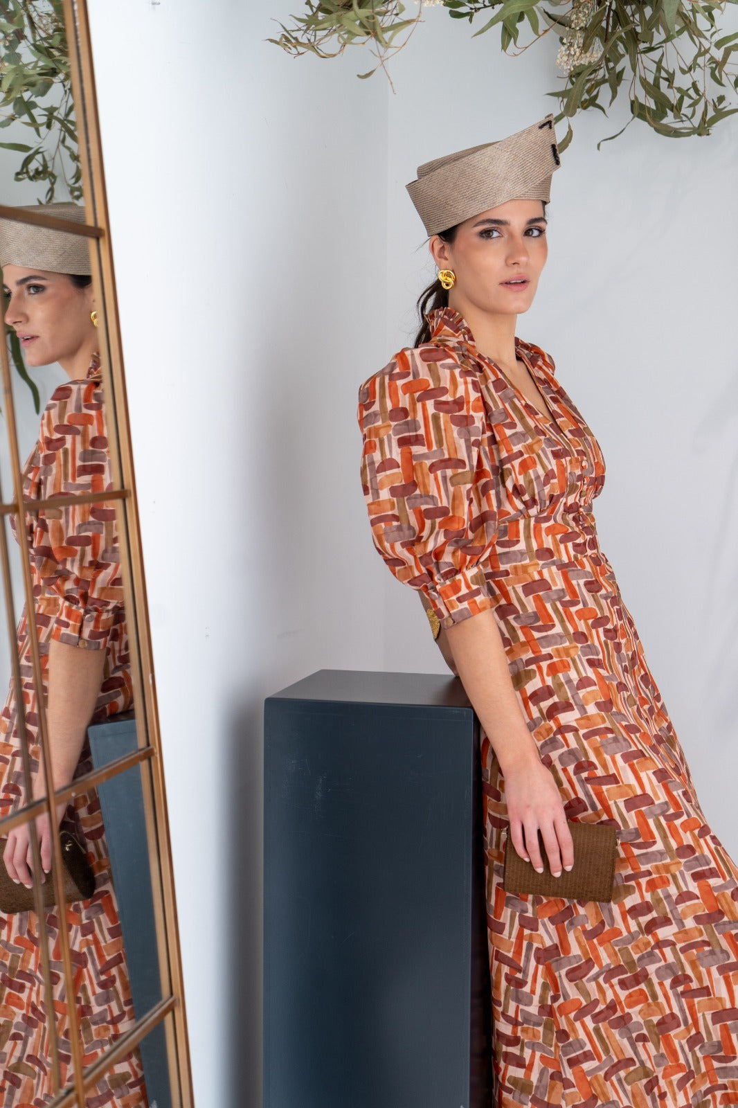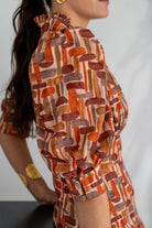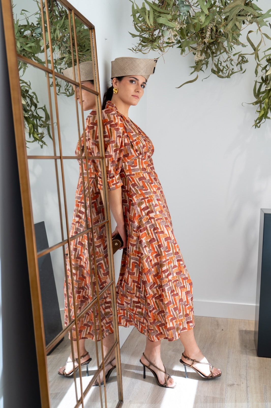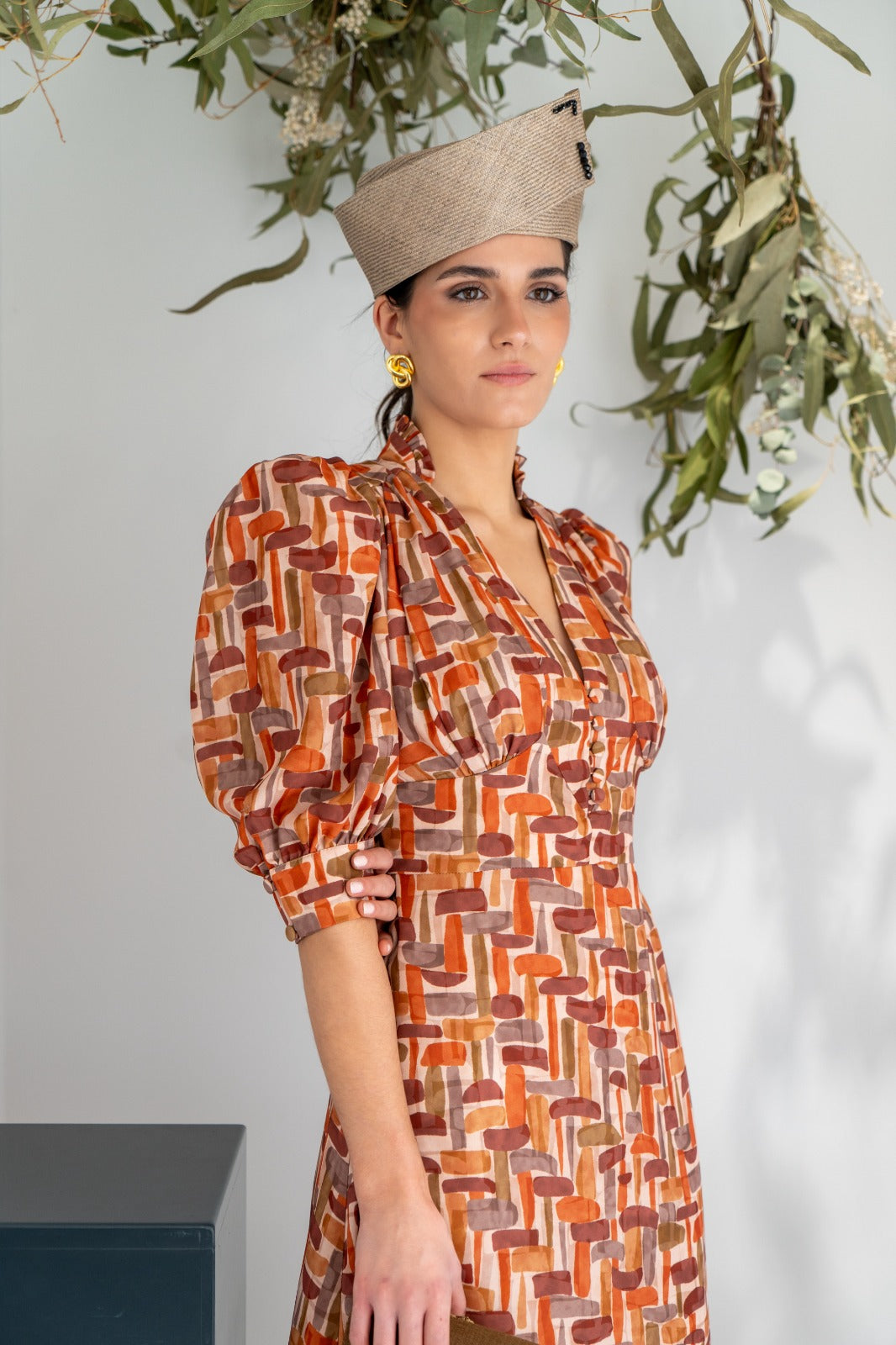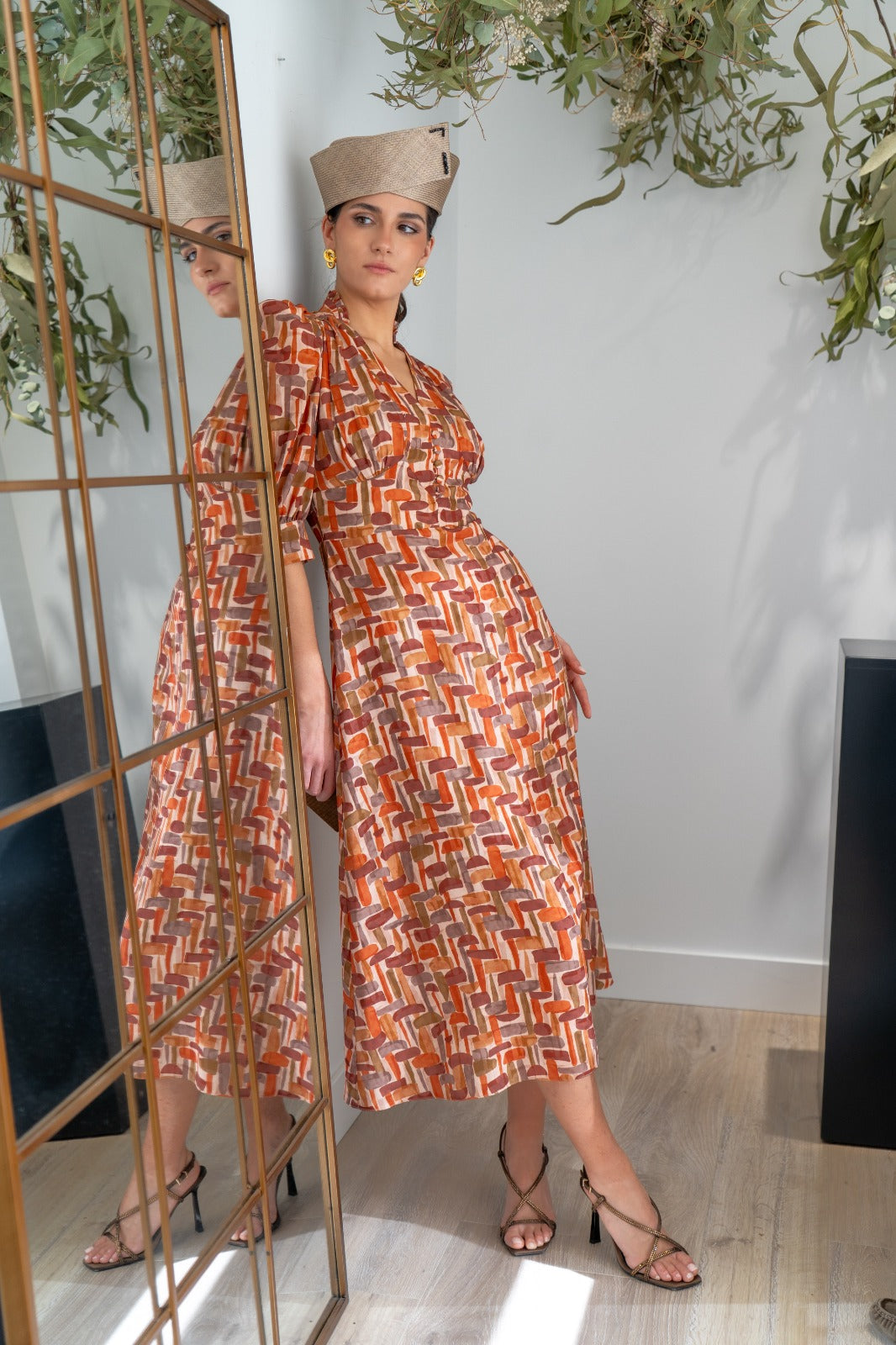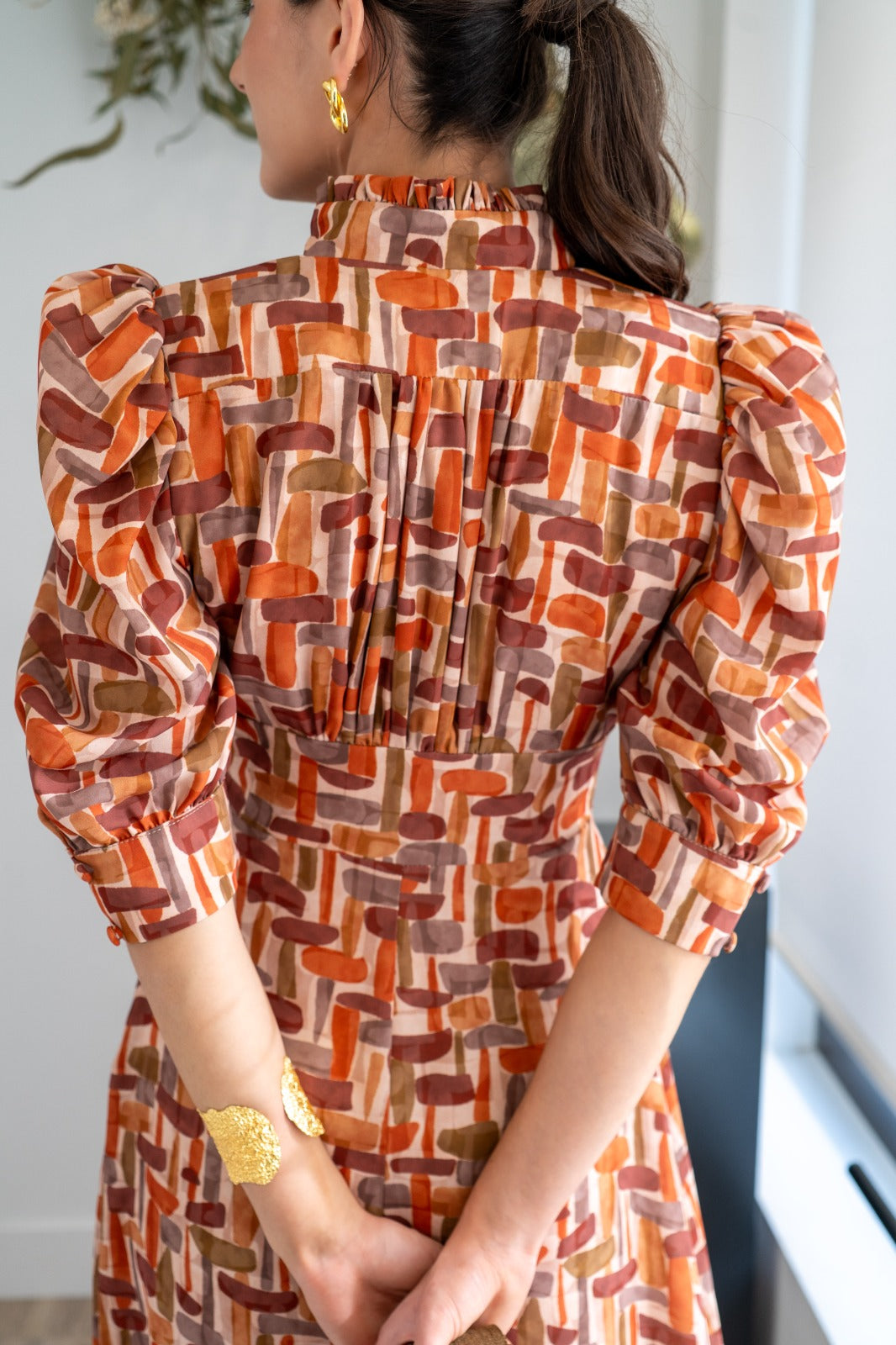 Midi dress, high V-neck, button detail, puff sleeves with cuffs, defined waist, flared skirt, flowing. Geometric print.