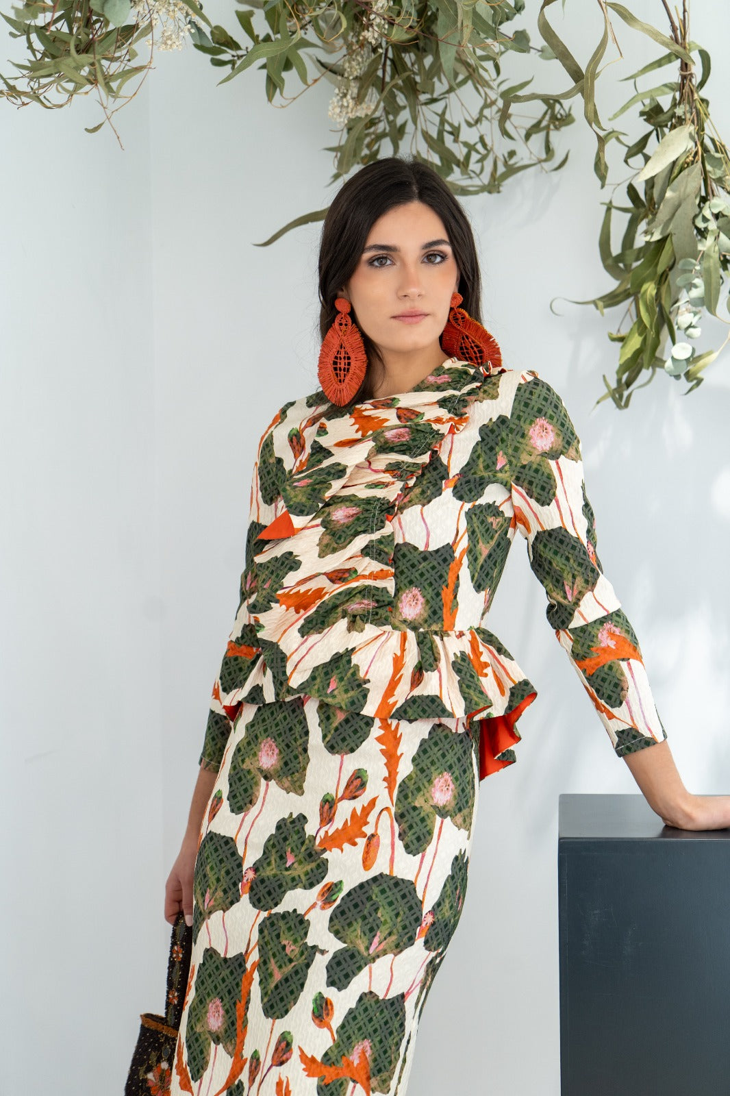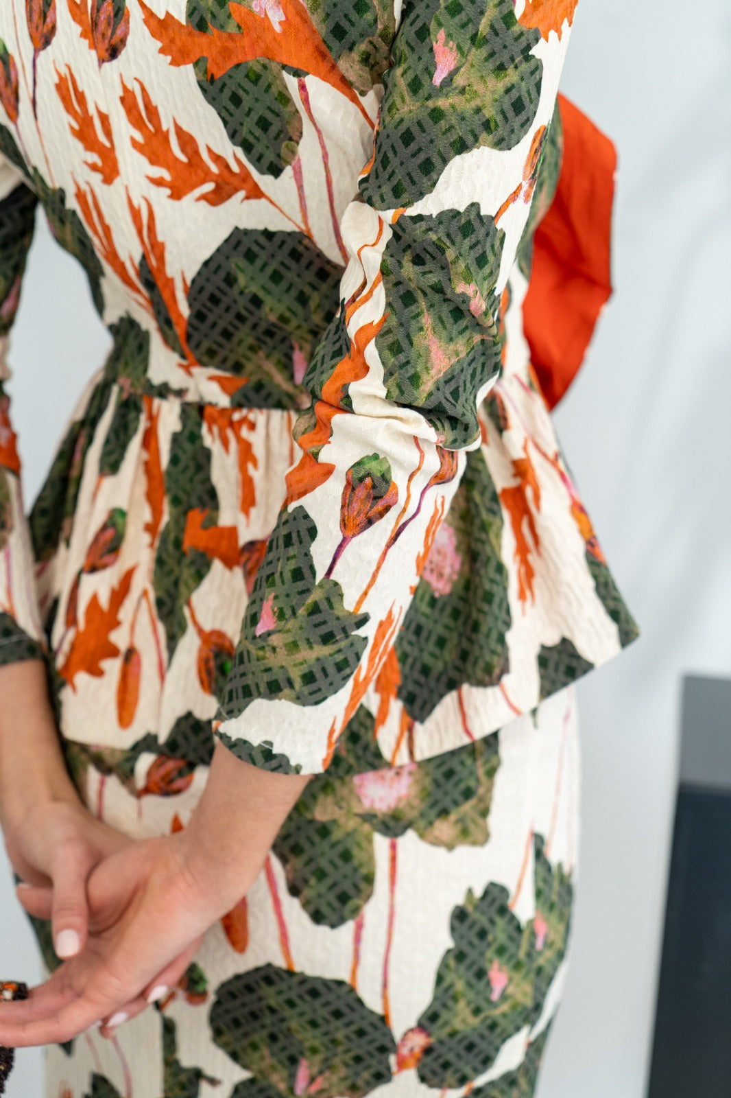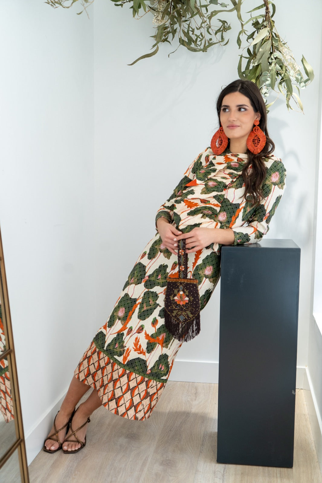 Vestido midi, escote redondo, manga larga, corte en cintura con volante delantero y cintura abertura trasera, bajo geométrico. En estampado beige, verde y naranja.