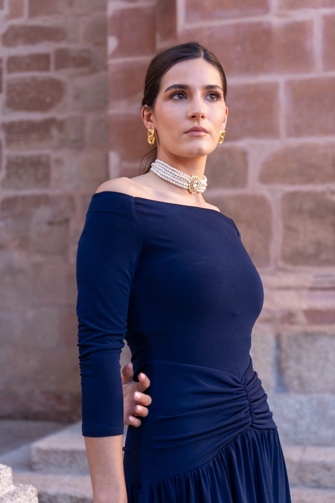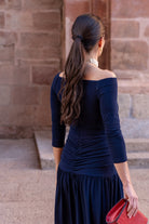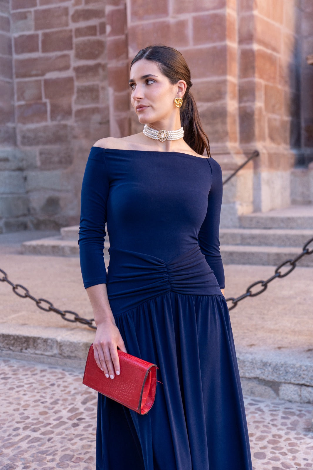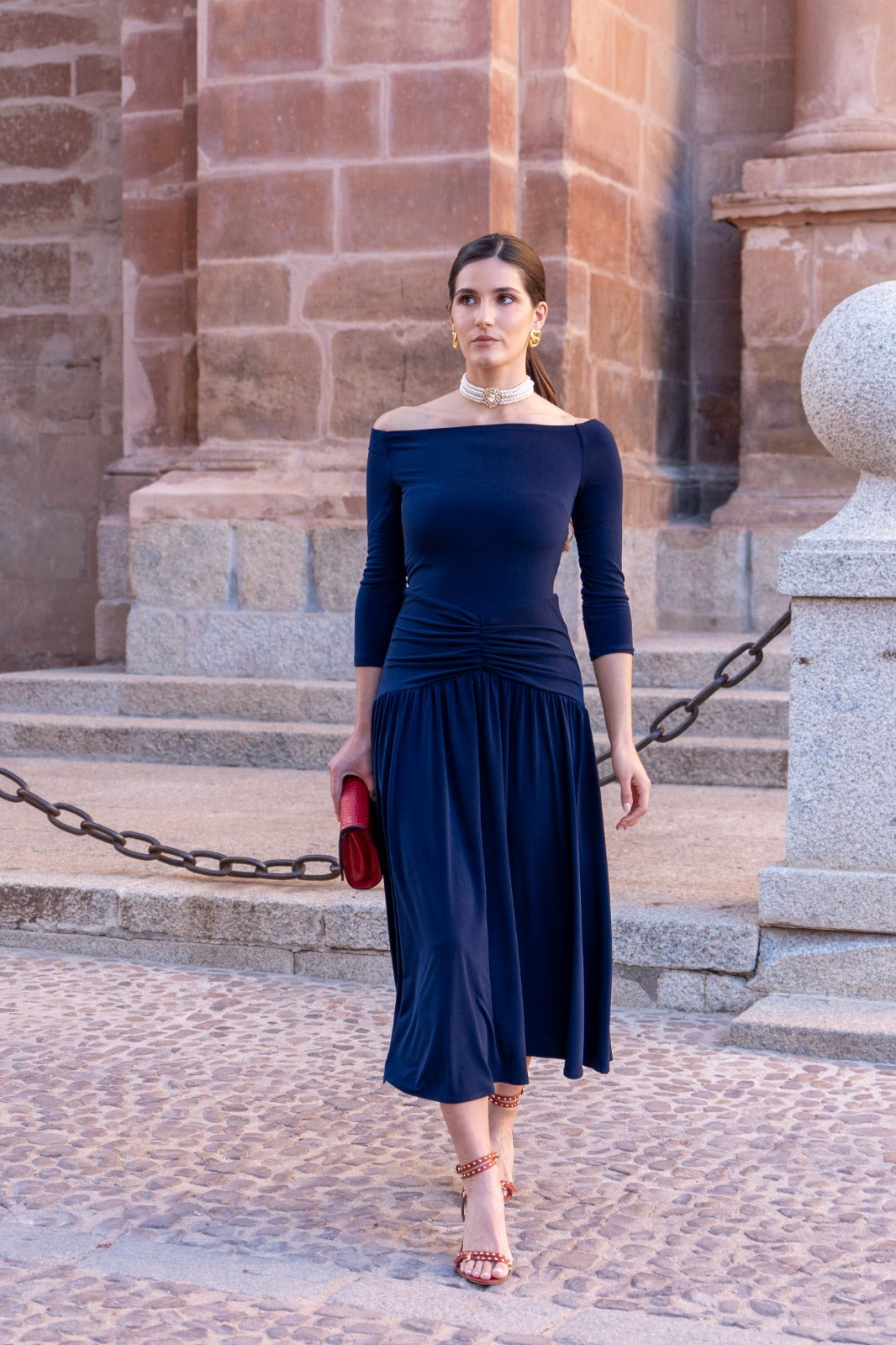 Vestido midi, escote bardot, manga francesa, fruncido en cintura, y falda fluida con vuelo. En punto seda color azul.