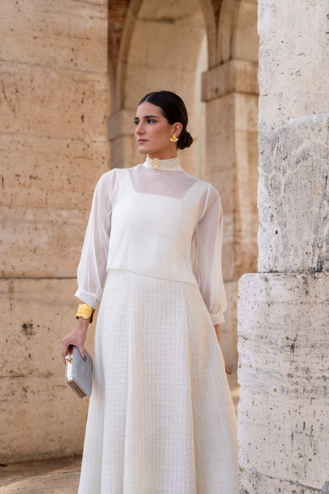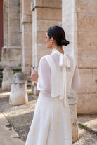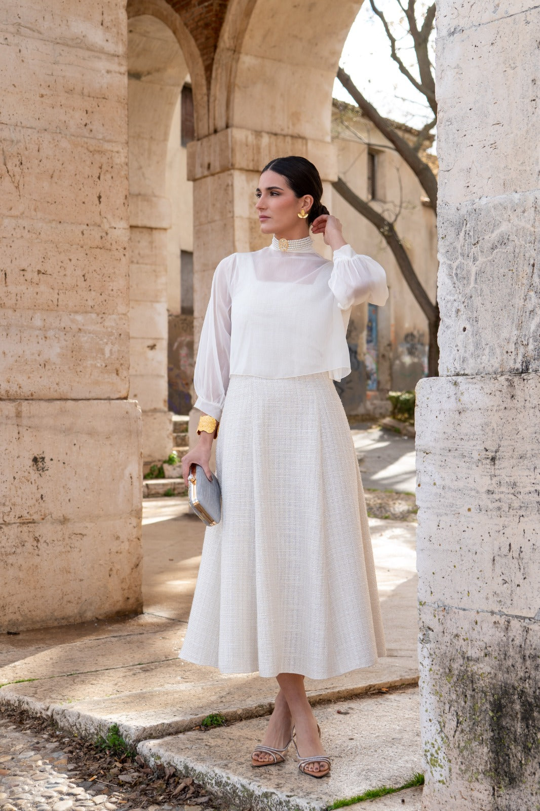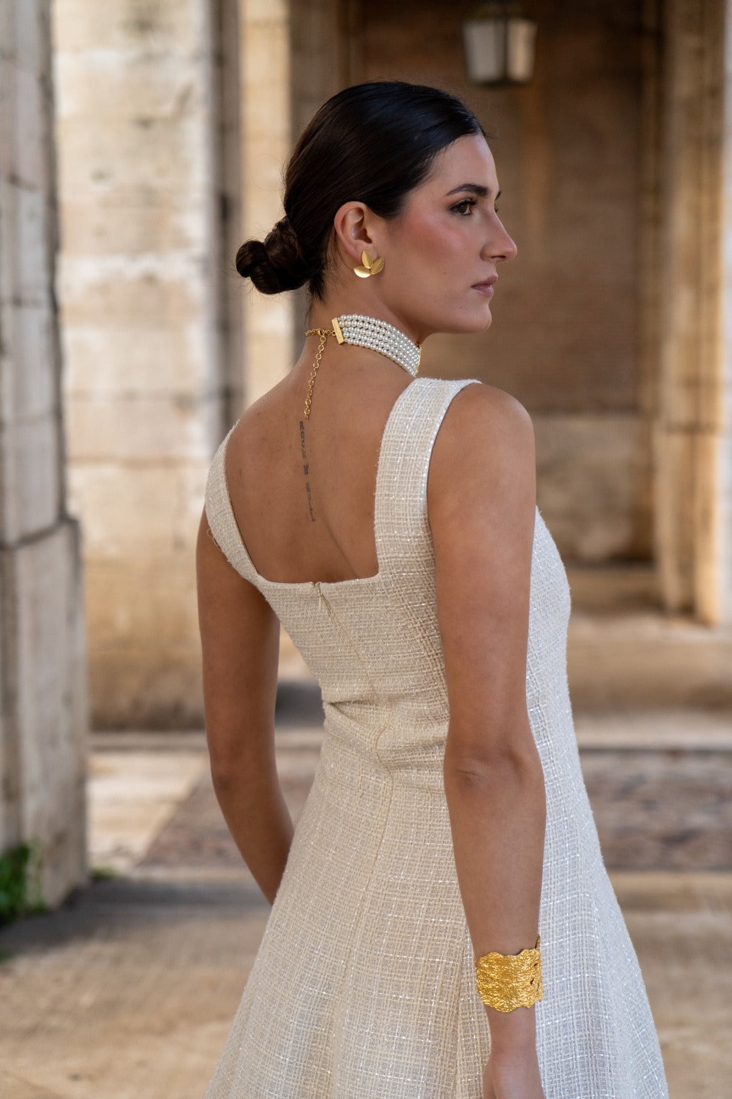 Midi dress with a square neckline at the front and back, wide shoulder pads, a flared skirt with a chiffon overlay, and three-quarter sleeves with a bow at the back. Made of beige fabric with lurex.
