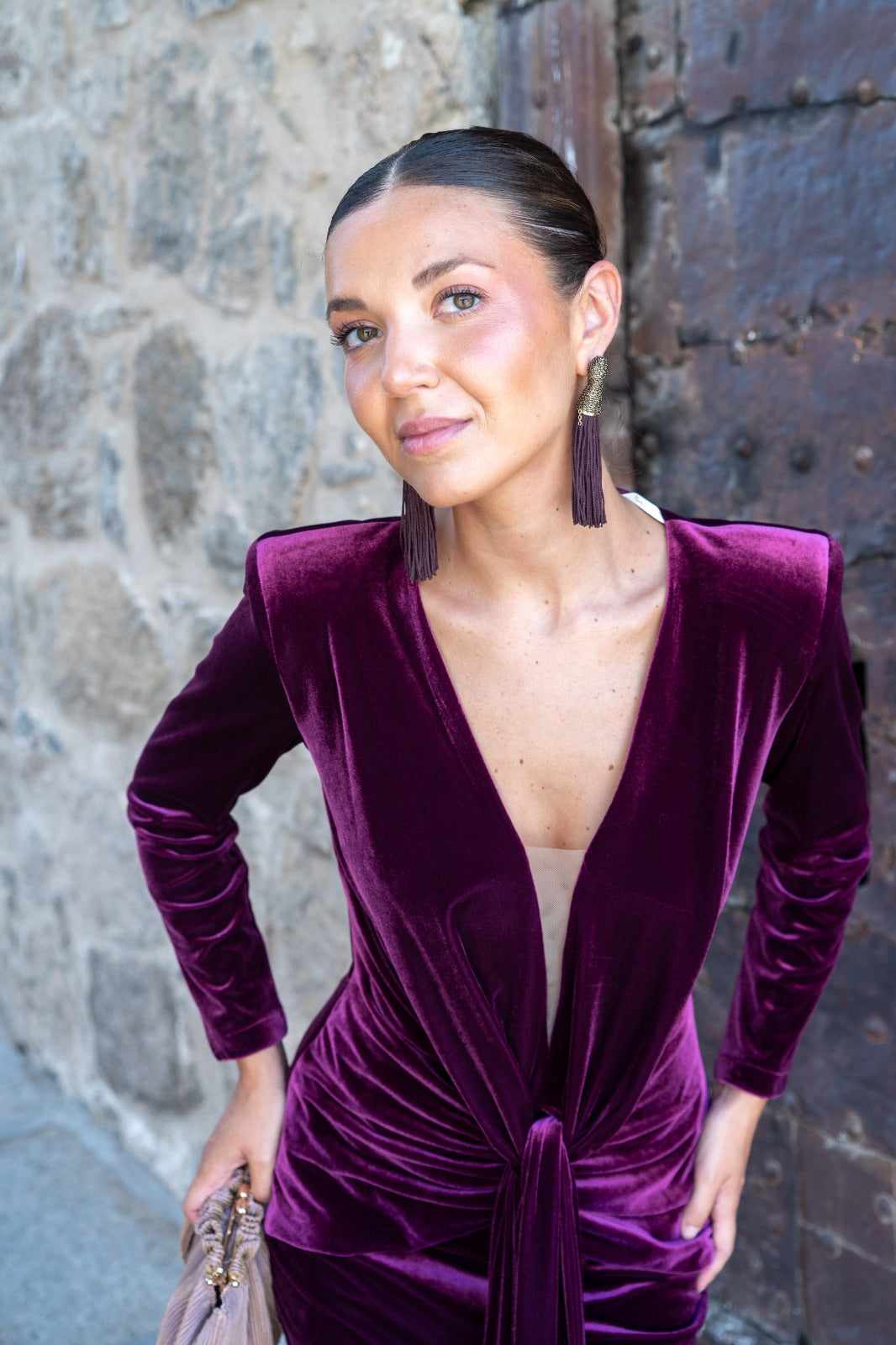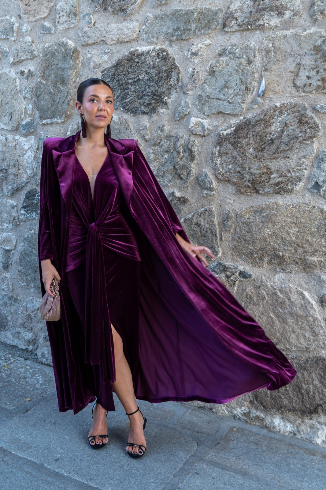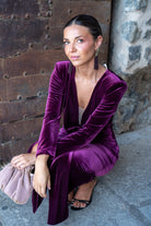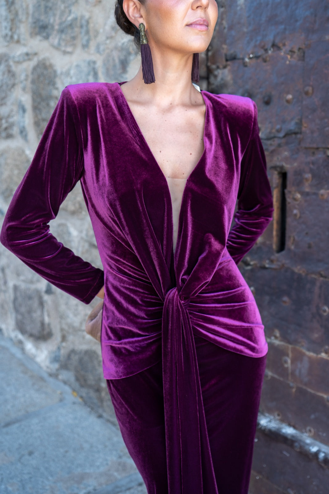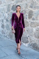 Midi dress with a V-neck in sheer fabric, long sleeves, a knot at the waist, and a front slit. In burgundy velvet. Perfect to pair with our ZAMIA cape.