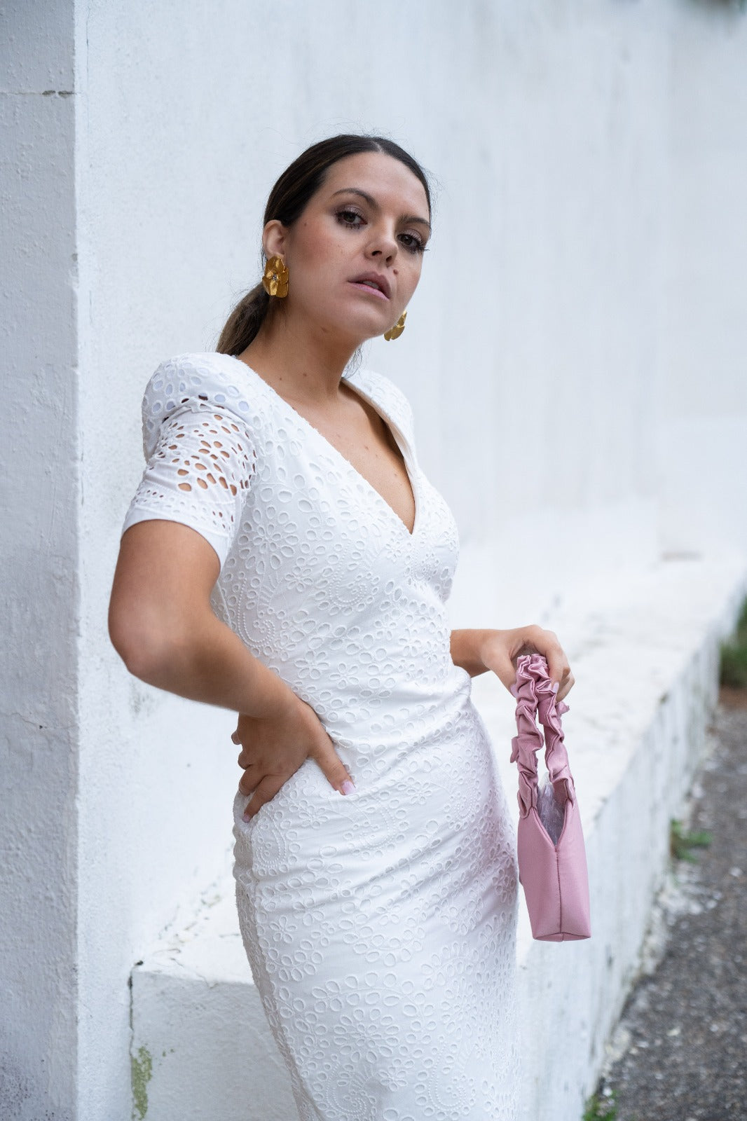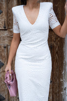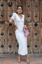 Midi dress with a V-neck, short sleeves, back slit, openwork, and high shoulder padding. In white.